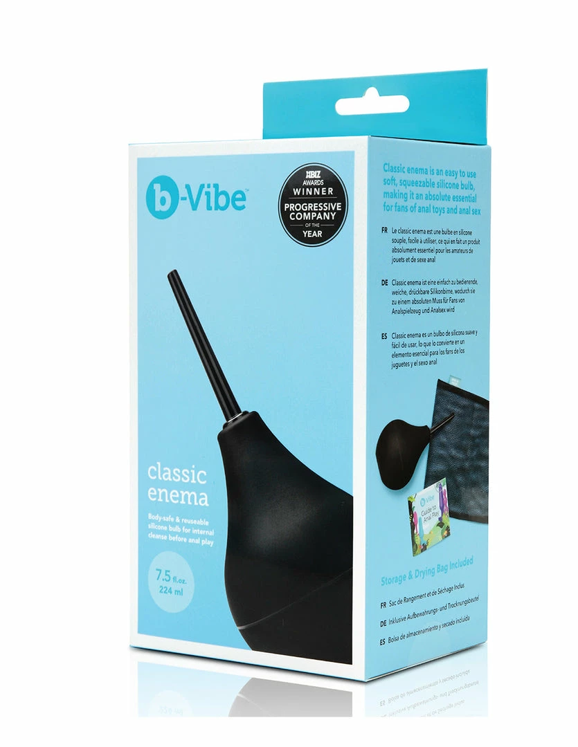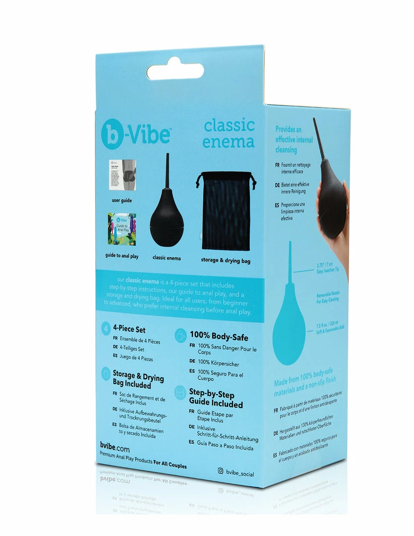 This Classic Enema by B-Vibe is essential for fans of anal toys and anal sex. Use it for a deep internal cleanse before engaging in anal play. It has a soft, silicone bulb at the end which makes it easy to squeeze. The tip is fully body-safe and small for comfortable insertion. It comes in 2 pieces for easy cleaning and storage. This enema also comes with a guide to help you navigate anal play.