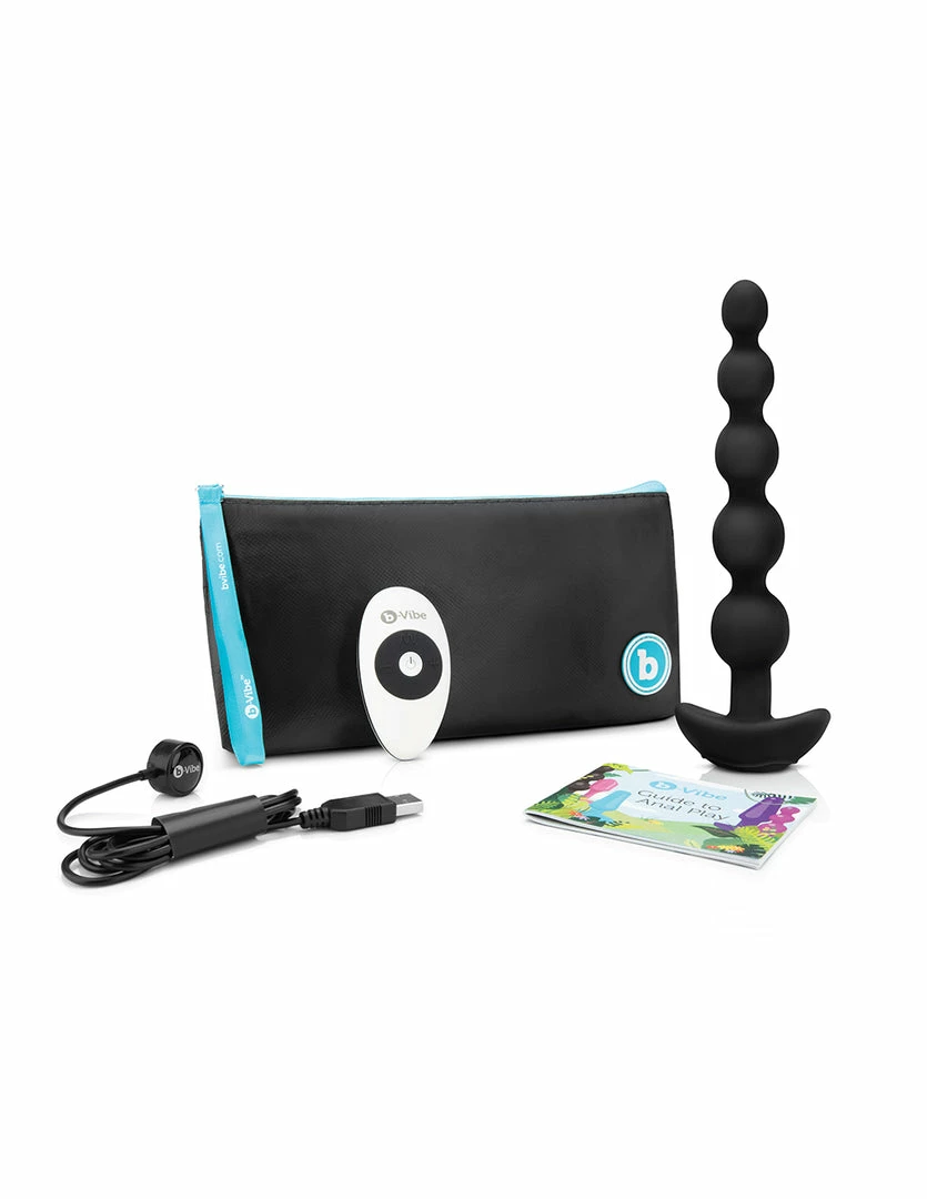 Cinco by B-Vibe is a long, remote control, anal beads vibrator. This vibrator is 8.2 inches long and 1.3 inches on its widest bead. It is made of smooth, non-porous silicone. It is USB rechargeable and splash proof, shower friendly. Cinco comes with a charging cord, small instruction manual, remote, and storage bag. It can be controlled from up to 30 feet.