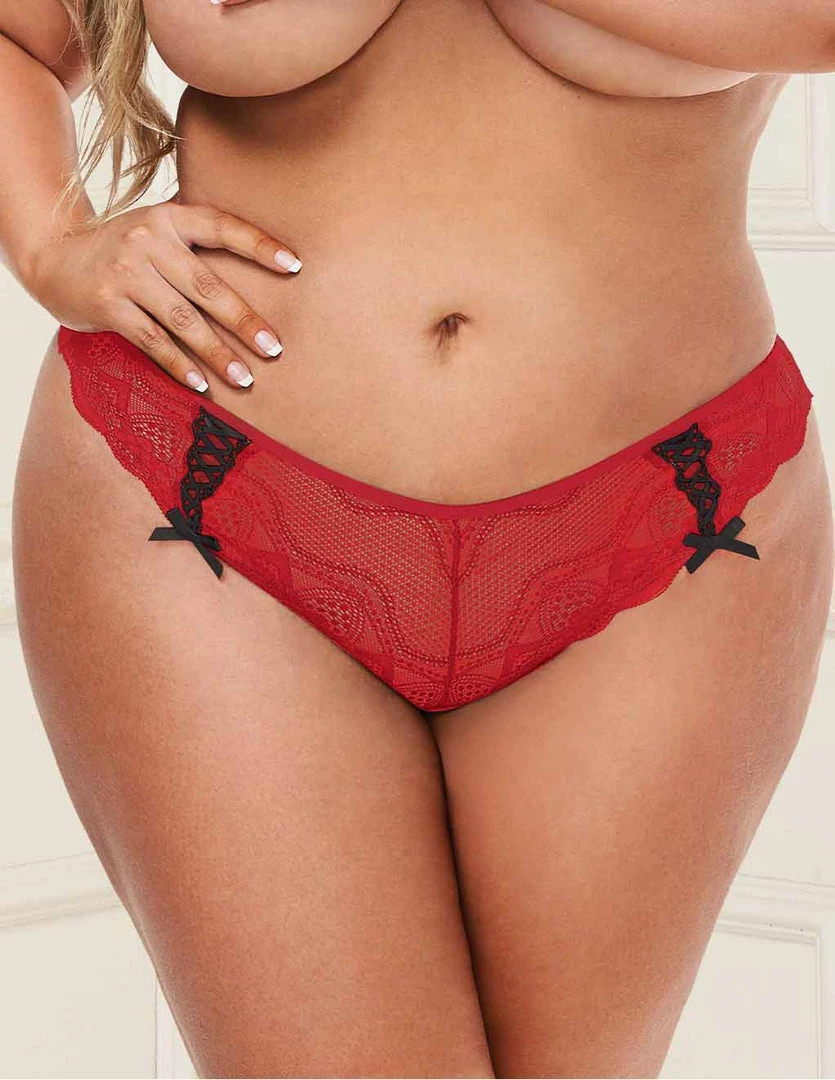 The Lace Ribbon Boyshort by Baci has a front to back stretchy laced detailing. Two down laced ribbons with bow accent on the left and right of the front side. High back cut, accentuates buttocks.