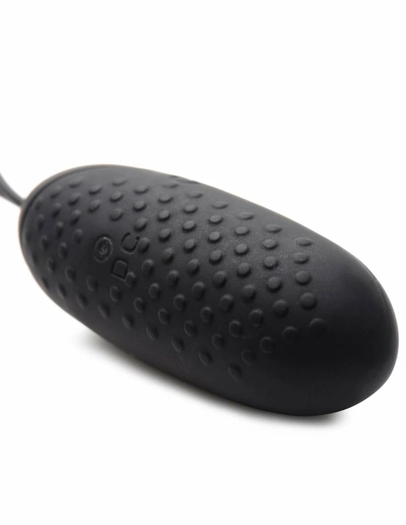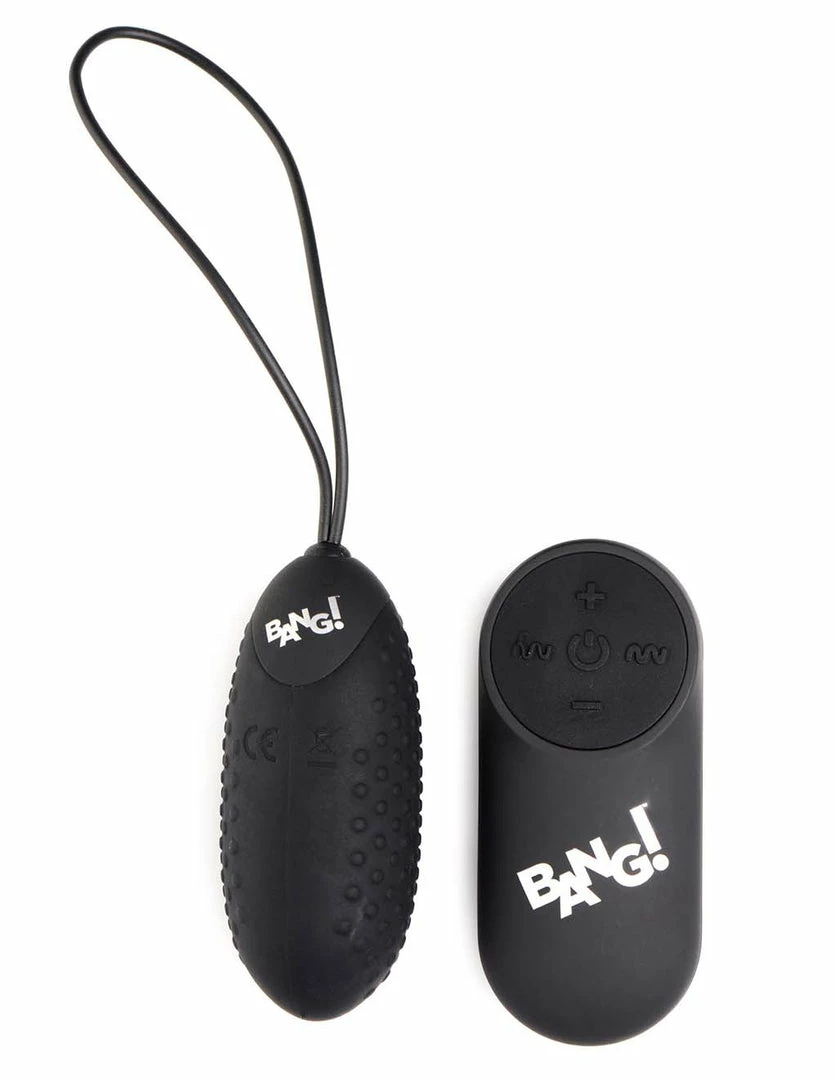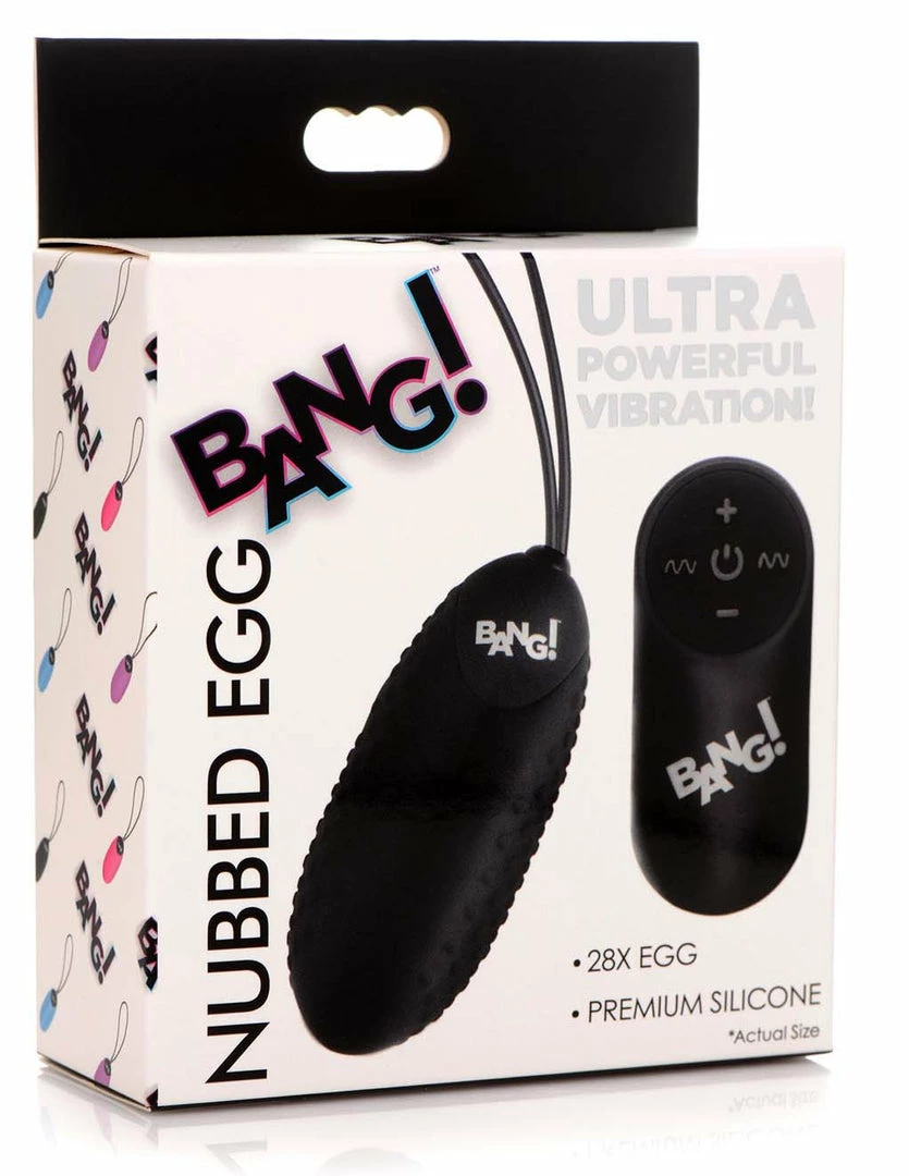 Bang! 28X Nubbed Silicone Egg is sure to bring your pleasure to a whole new nub-ula! This remote controlled vibrating silicone egg brings all the fun with rumbling action. The powerful motor operates with 4 speeds and 7 patterns of powerful vibrations. The soft nubbed texture is made up of a body safe waterproof silicone. Let the combination of the nubbed texture and vibrations stimulate you for a smooth climax. Have your partner take control by utilizing the remote. The safety cord sticks out for 3.6 inches. The overall length measures to be 2.75 inches by a width of 1.2 inches. In the kit includes a USB charging cable so you never get to run out of the vibrating fun! Bang! 28X Nubbed Silicone Egg is sure to stimulate amplifying solo or partner play.