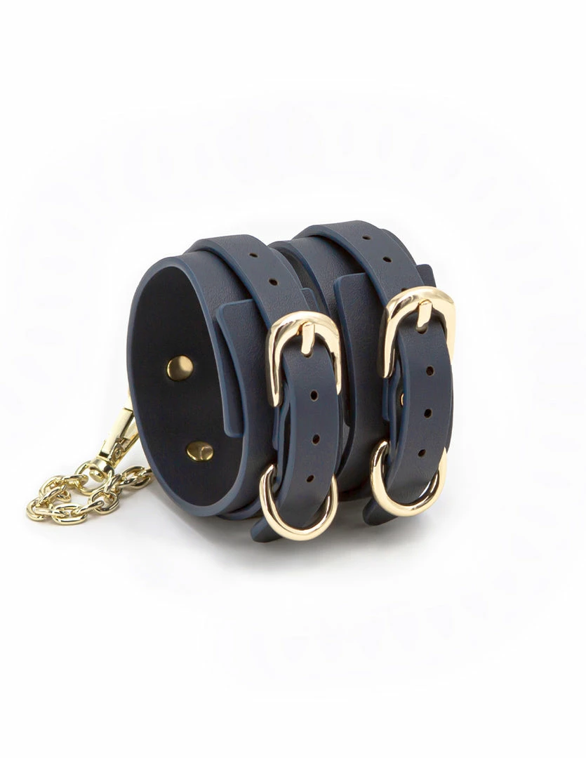 These Bondage Couture Ankle Cuffs by NS Novelties are gorgeous. They are made with vegan leather (PU) and gold colored hardware. It has a detachable chain with 2 blue ankle restraints. The vegan leather is soft and smooth. The gold chains feel light and cool against your skin. The blue leather is luxurious to look at and comfortable to wear. These ankle cuffs have a 1 year manufacturer’s warranty through NS Novelties.