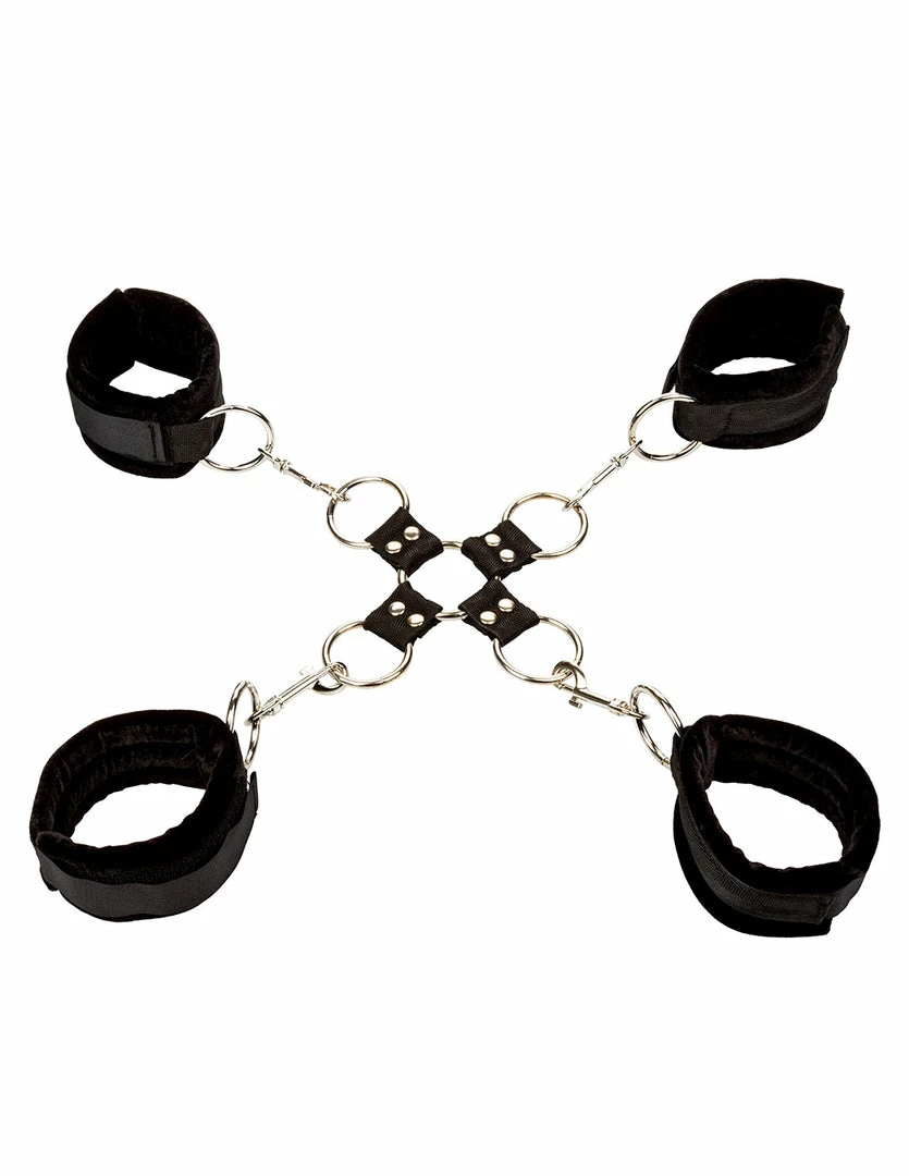 Hustler’s Premium Hog Tie is extra versatile and allows you to explore your dominant/submissive sides with multiple variations of restraint play. The Hog Tie makes for a much simpler method of tying up that special someone. No having to fumble with bondage ropes and hoping your knots hold. Included is 4 pairs of soft, velvet, velcro cuffs that are easy to get into and out of, plus a connector straps holding everything together. The cuffs can be used in any combination and can even be disassembled and used as individual wrist or ankle cuffs. This hog tie is designed to offer the ultimate in comfort and support to achieve new sexual positions with ease and confidence, leaving all the focus on pleasure.