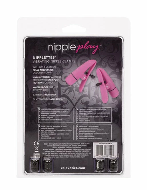 Add some zing to your nipple play with Nipplettes by Nipple Play. They are 2.75 inches long and have a satin smooth finish. It delivers pressure and vibration stimulation. Adjust each clamp with the thumb screws to change the pressure. Clamp these nipple vibrators around each nipple after foreplay. It feels great having both nipples stimulated while masturbating or having sex. Either partner can uses these vibrating Nipplettes.