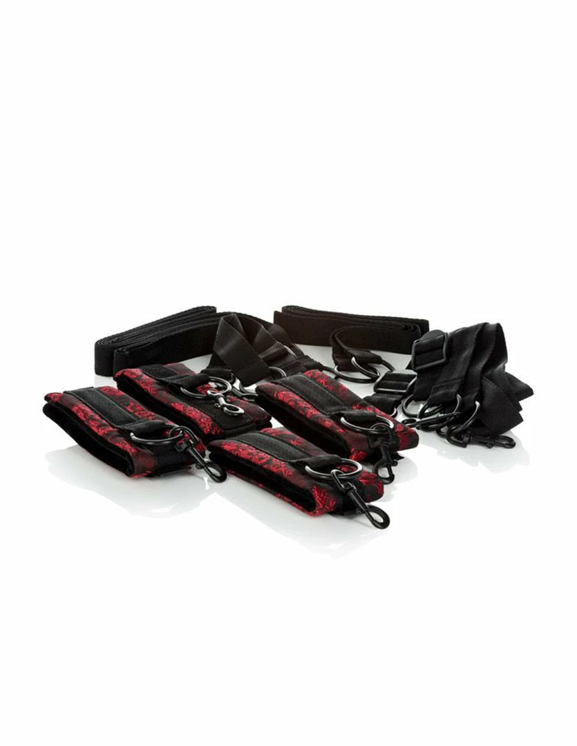 Get in touch with your kinky side using Scandal’s Bed Restraints. It comes with 4 cuffs with universal clasps and 4 tethers that can be tied around the bed or other house hold furniture. The cuffs are lined with soft faux suede on the inner lining, soft cushioning in the middle, and red and black designer fabric on the outside. They are double stitched for durability. A universal clasp can be found on each cuff. They look and feel luxurious.