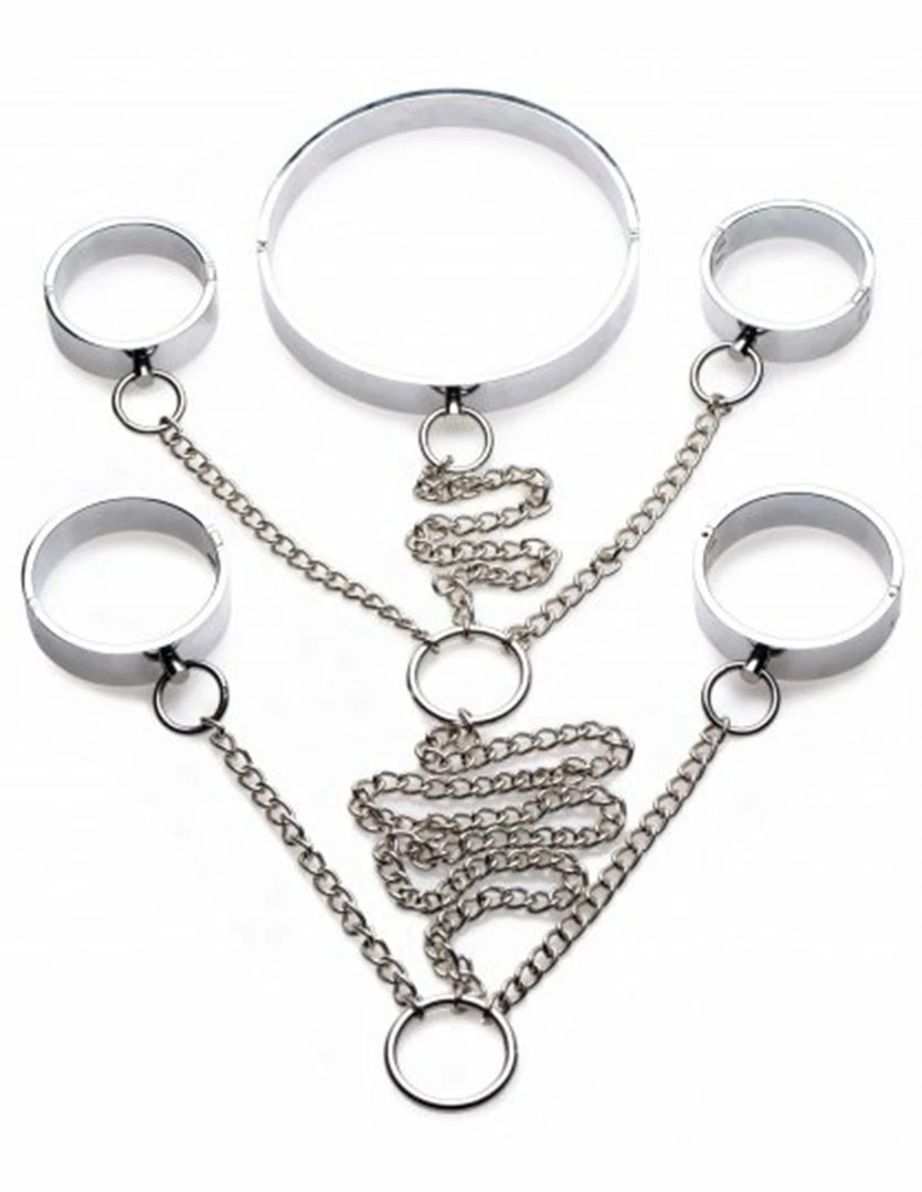 This Shackle Set is made of real stainless steel. It has a pinch hole locking mechanism that is invisible when you are adorning your partner. It comes with an easy unlatching key. This is a full body restraint, with each pretty shackle connected by chain to an O-ring. Have your partner spread on all fours or have them stand to show off this beautiful set.