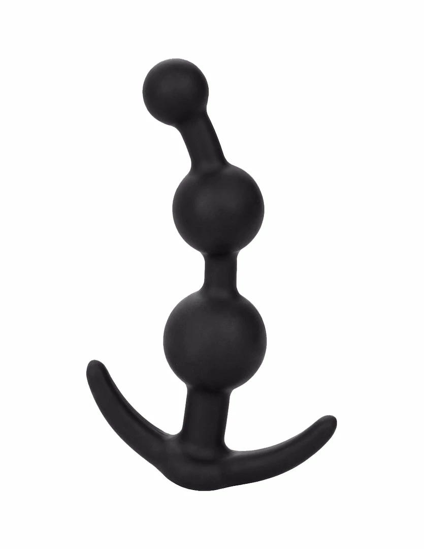 Booty Beads by Booty Call is a beaded anal plug. This plug is ergonomically curved. It is made of silicone material. This plug is 4.75 inches long and 1.25 inches wide. It has 4 inches of insertable length. These beads have gradual descending beads from small to large. The first one is small for easy insertion. Each bead has space to relax after inserting each one. It has a flared base that sits between the cheeks and keeps Booty Beads anchored. These beads are perfect for beginners. Wear them during sex or masturbation. Use plenty of water based lubricant.
