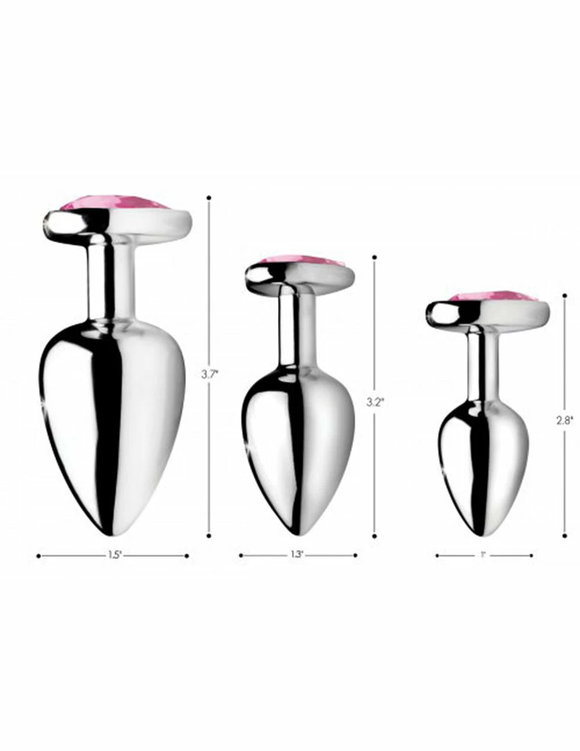 Tease and please your derriere with these Pink Heart Plugs by Booty Sparks. They come in a set of 3. The large plug is 3.7 inches long, 1.5 inches wide, and has 3.4 inches of insertable length. The medium plug is 3.2 inches long, 1.3 inches wide, and has 3 inches of insertable length. The small plug is 2.8 inches long, 1 inch wide, and has 2.4 inches of insertable length. These plugs are made of aluminum alloy and ABS plastic.