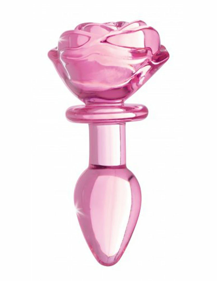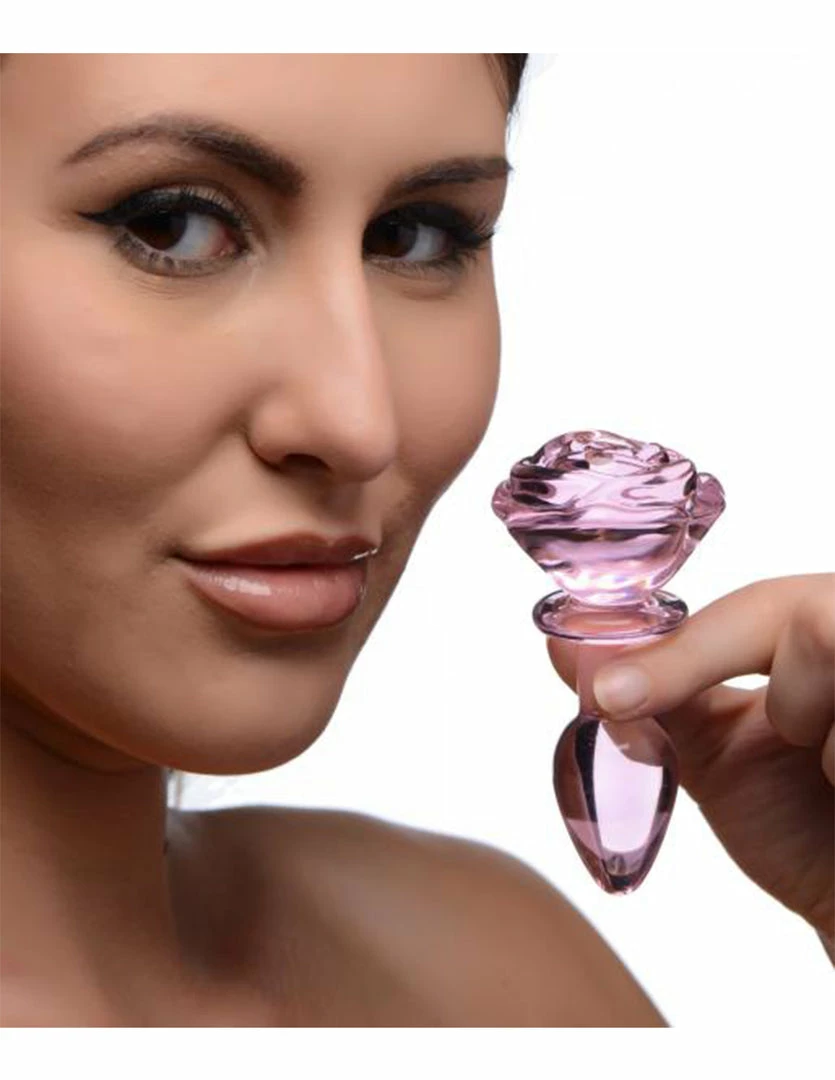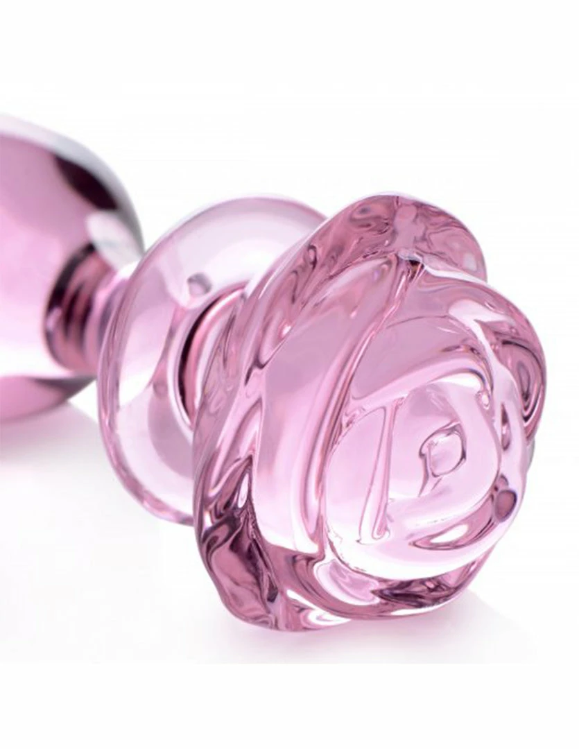 This Pink Rose Glass Plug by Booty Sparks is pretty and easy to use. Its blooming rose top is a functional handle. It has a tapered tip for ease of insertion and a narrow neck to comfortably sit the plug between the anal sphincter.