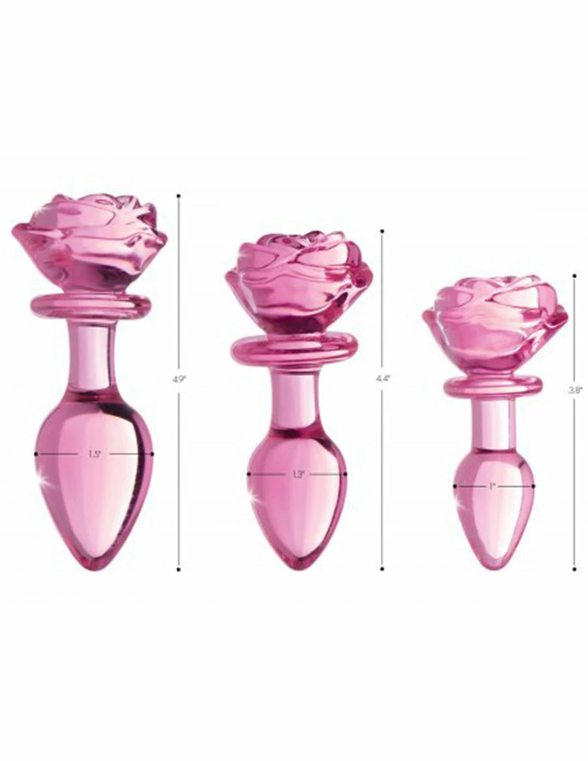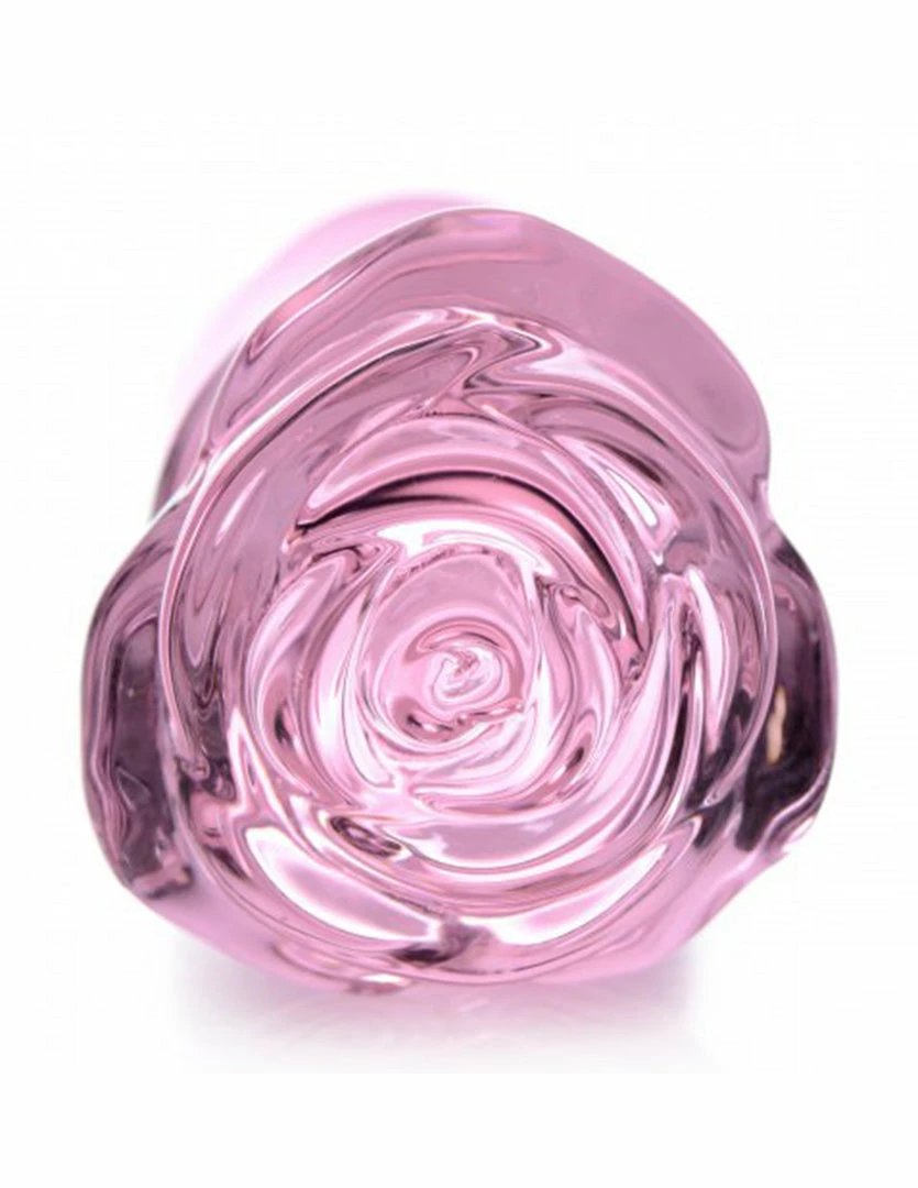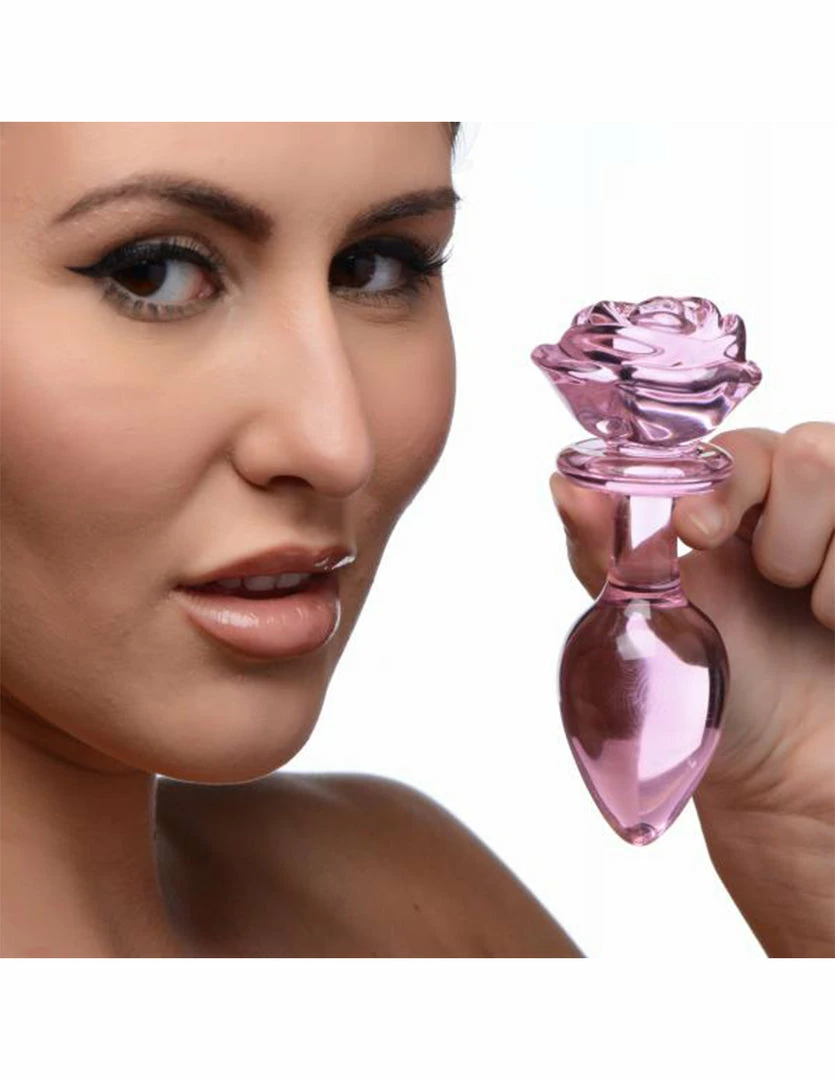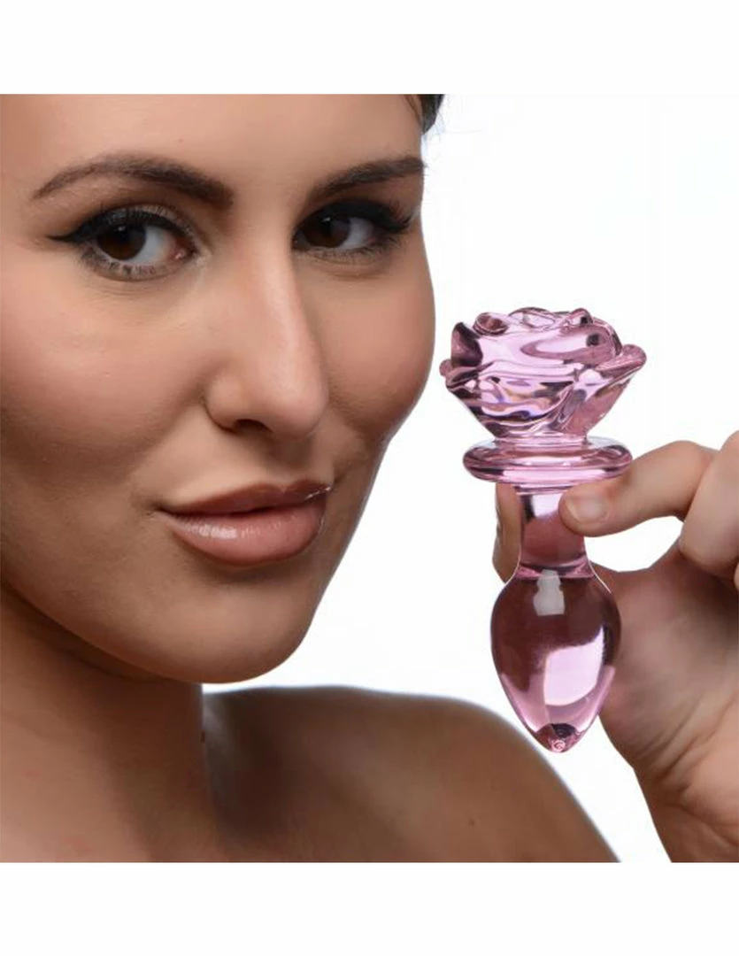 This Pink Rose Glass Plug by Booty Sparks is pretty and easy to use. Its blooming rose top is a functional handle. It has a tapered tip for ease of insertion and a narrow neck to comfortably sit the plug between the anal sphincter.