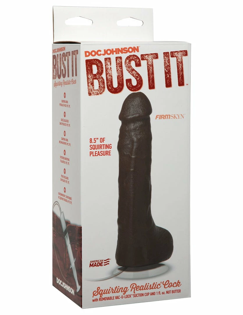 Make your creampie fantasies come true with the Bust It Squirting Realistic Cock. This squirting dildo is large and girthy. It is 9.2 inches long, 8.5 inches of insertable length, and 2 inches wide. It is thick and firm with FIRMSKYN material. It comes with 1 oz of Nut Butter. Push it through the syringe to make it squirt out! The texture of the nut butter is almost like the real thing. It is a hybrid of water and silicone based lubricant. The base has a removable Vac-U-Lock suction cup. This dildo can be attached on to any Vac-U-Lock harness or machine. Now you can get creampied any time!