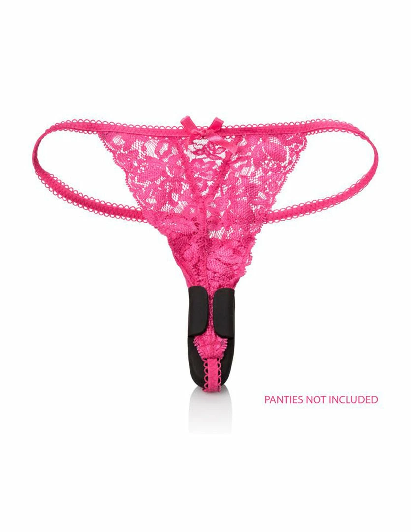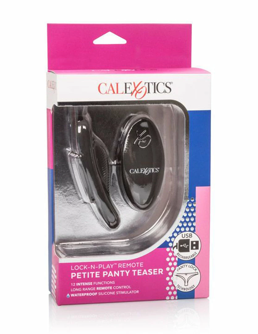 Play with your lover from up to 33 feet with Cal Exotics Lock-N-Play Remote Panty Teaser. The small bullet locks in place on the panty with magnetic tabs. It has 12 vibrating patterns. The wireless bullet has coutured texture in place to arouse the labia and clitoris. The bullet also has a memory chip, so you can start again from where you left off. This toy can be used solo or with a partner.