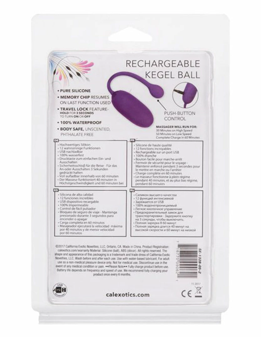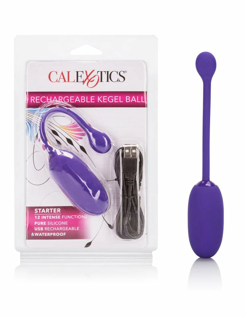 The Rechargeable Kegel Ball by CalExotics is a pleasurable way to work out your pelvic floor muscles. This Kegel ball is 3 inches long and 1.25 inches wide. It is made of silicone material. Charge up this vibrator with its USB cable and explore 12 vibration patterns. Its retrieval cord cycles through all the vibration patterns. It has a travel lock to avoid accidental vibration. It has a memory chip that remembers the last functions used so you can always turn it on to your favorite setting. Click through all the functions to be teased. It is 100% waterproof and can be used in the tub or shower. Squeeze the Kegel ball with your pelvic floor muscles to strengthen your area. 15-20 minutes 3 times a week is highly recommended. Use this Kegel ball with water based lubricant for comfortable insertion.