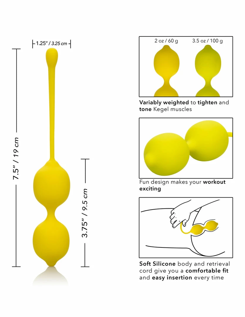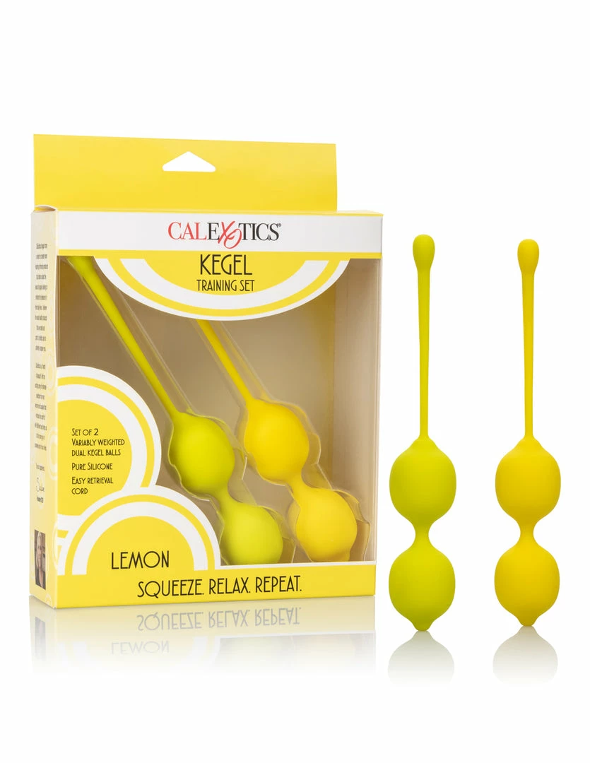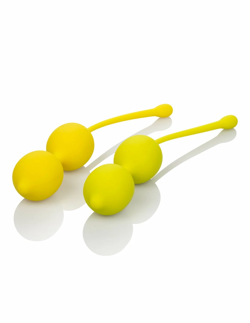 Start strengthening your muscles with this 2-piece Lemon Kegel Training Set by Cal Exotics. This set is designed to strengthen and train your pelvic floor muscles as well as increase sexual arousal. The kit has 2 gradually weighted exercisers to gently increase exercise intensity and pleasure. Strengthening those muscles can help reduce the risk of pelvic floor disorders or incontinence.