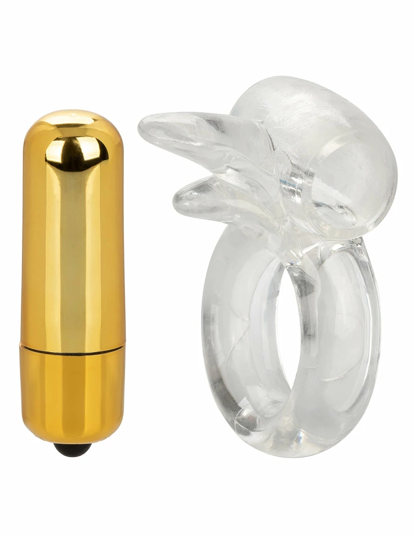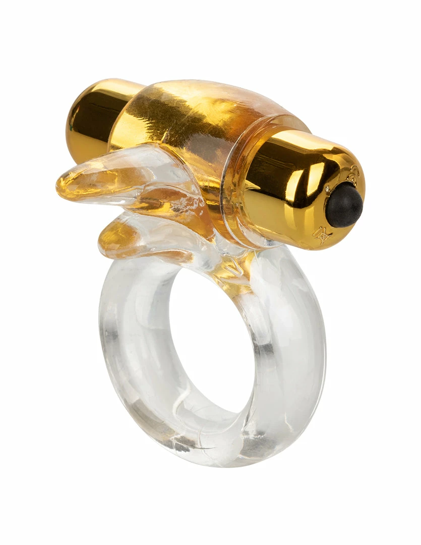 The Pure Gold Double Trouble Enhancer is a couple’s vibrating cockring. This cockring is 2.5 inches long and 1.75 inches wide. It is made of TPE and ABS material. The vibrating bullet requires 3 watch batteries (included). It is fully waterproof and stretches to over 3 times its size.