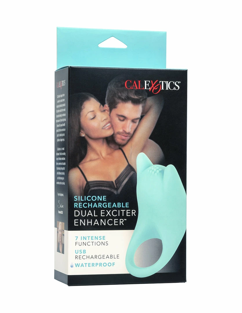The Dual Exciter Couple Enhancer by CalExotics is a vibrating cockring. This cockring is 3 inches long and 2.5 inches wide. Its ring is 1 inch wide and can stretch up to 3 times its size. It is made of silky smooth silicone material. It is non-porous and very hygienic. This vibrating cockring is USB rechargeable and waterproof. It has 7 vibration patterns and speeds to play with.