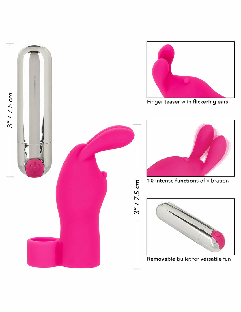 The Finger Bunny by Intimate Play is cute and USB rechargeable. This vibrator is 3.25 inches long and 1.25 inches wide. It has a soft silicone bunny sleeve. Tease the clitoris and labia with its long ears and prominent nose. This bullet has 10 vibrating patterns. Slip your finger through its silicone ring and tease your entire body. It attaches to your finger so you don’t have to hold on to the bullet. This bullet is great for couples during foreplay or sex. The sleeve is removable. This toy is 100% waterproof. It can be used in the bedroom or the shower.