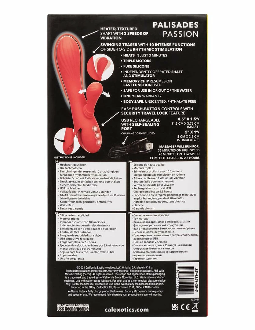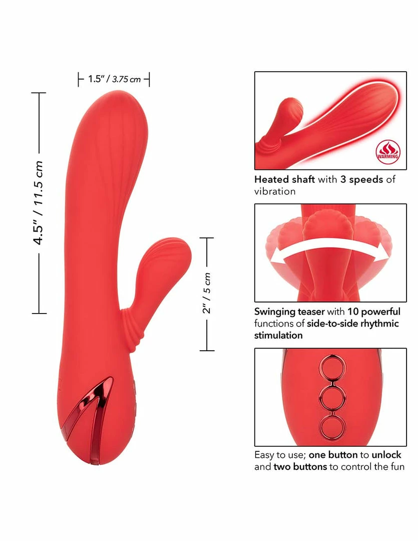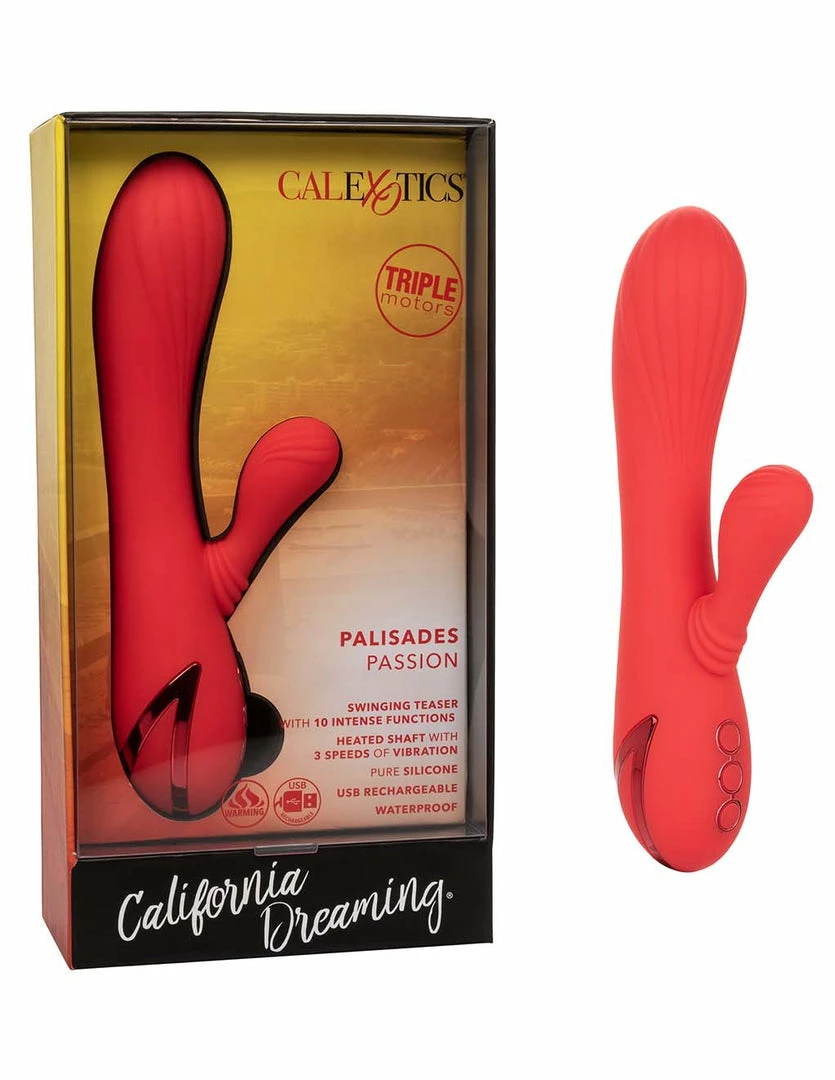 The joy of a sunny side escape is brought into your bedroom with the California Dreaming Palisades Passion. Let the heat rise full of burning passion with this red hot massager that features a textured shaft and a swinging teaser end. Enjoy the 3 vibration speeds of the shaft and the swinging rabbit all while experiencing a warm sensation. Within 3 minutes the warming function will reach the perfect temperature. The stimulating swinger moves rhythmically side to side stimulating your clitoris. The vibrations and warming elements ease in the tapered and gripped texture of the shaft easily makes its way to penetrate your g-spot. With a full charge using the included USB charging cable you’ll be able to play up to 30 minutes using the 4 button control. The textured shaft measures up to 4.5 inches by 1.5 inches as the swinging teaser measures up to 2 inches by 1 inches. To turn the heat up more, use the Palisades Passion with a water based lubricant.