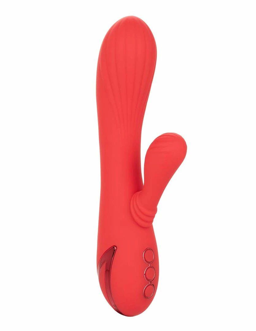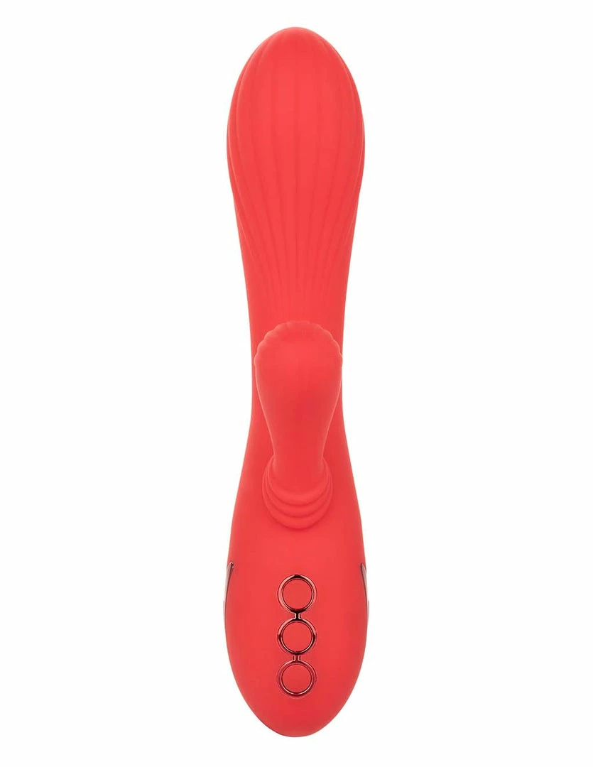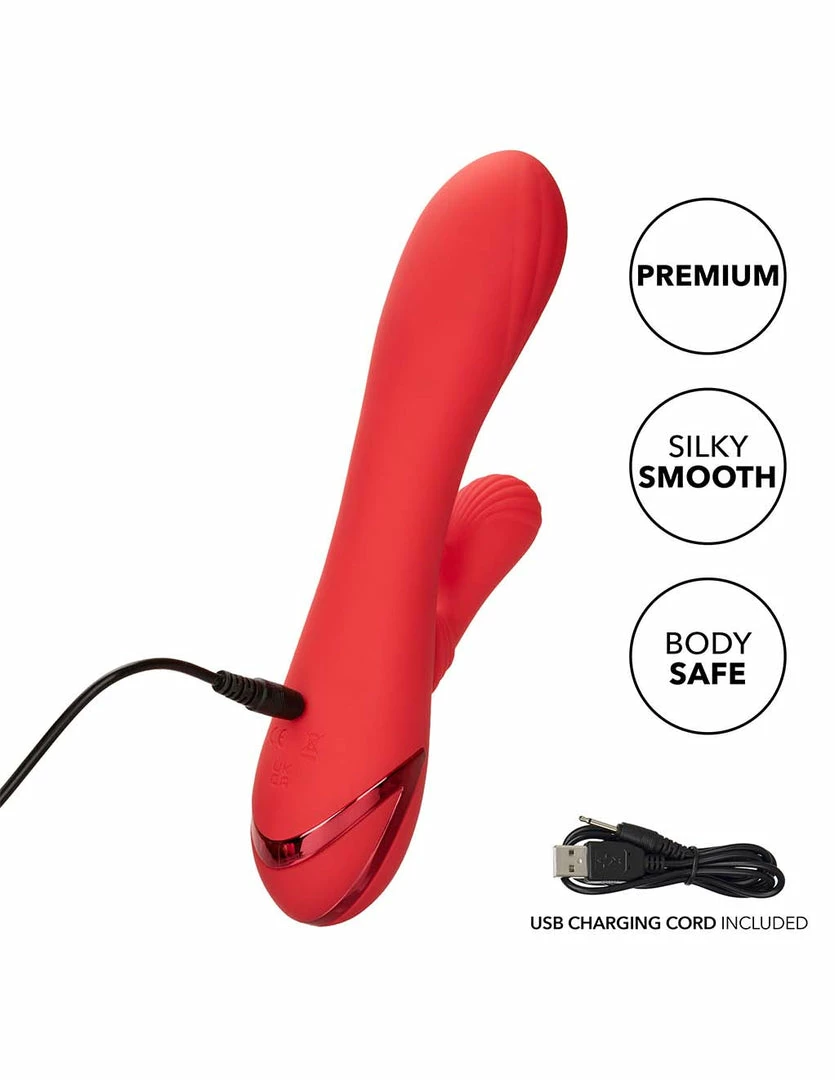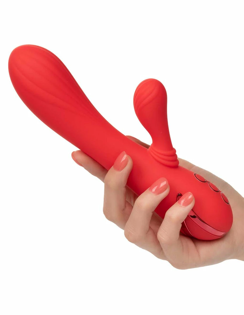 The joy of a sunny side escape is brought into your bedroom with the California Dreaming Palisades Passion. Let the heat rise full of burning passion with this red hot massager that features a textured shaft and a swinging teaser end. Enjoy the 3 vibration speeds of the shaft and the swinging rabbit all while experiencing a warm sensation. Within 3 minutes the warming function will reach the perfect temperature. The stimulating swinger moves rhythmically side to side stimulating your clitoris. The vibrations and warming elements ease in the tapered and gripped texture of the shaft easily makes its way to penetrate your g-spot. With a full charge using the included USB charging cable you’ll be able to play up to 30 minutes using the 4 button control. The textured shaft measures up to 4.5 inches by 1.5 inches as the swinging teaser measures up to 2 inches by 1 inches. To turn the heat up more, use the Palisades Passion with a water based lubricant.