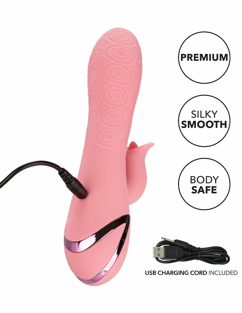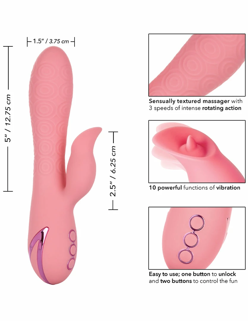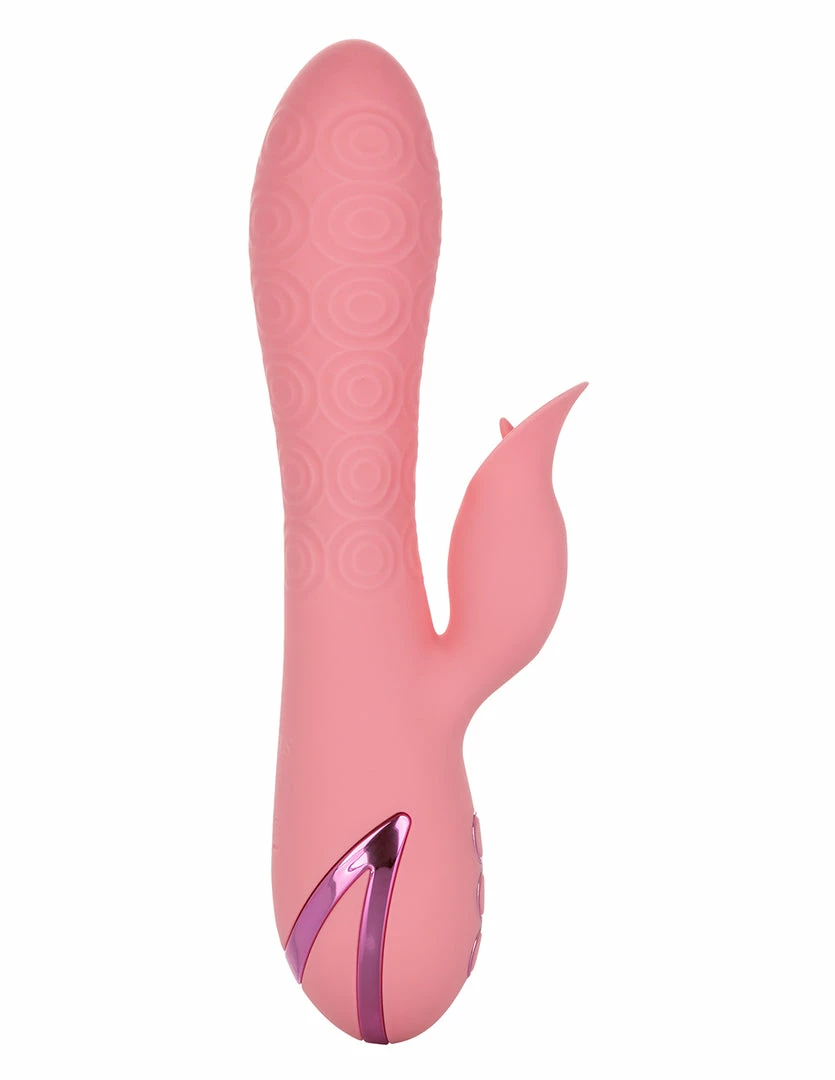 Pasadena player has a tapered tip and bulbous head. Its smooth, textured surface area massages the vaginal muscle as it is inserted. Its tapered tip guides the toy with ease. It has a narrow neck to allow the opening of the vaginal muscle to relax around it. This shaft undulates and massages against the G-spot while it is inside. The clitoral piece cups the clitoris and stimulates it with a small flickering tongue. Together with the rotating shaft and vibrating clitoral piece, you can experience blended orgasms.