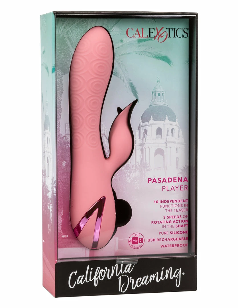 The Pasadena Player by California Dreaming is a flicking, textured rotating shaft, dual-stimulating vibrator. It is 8.5 inches long, 2 inches at widest, and has 5 inches of insertable length. Pasadena Player is made of smooth silicone material. It is USB rechargeable and 100% waterproof. It also features a travel lock function.