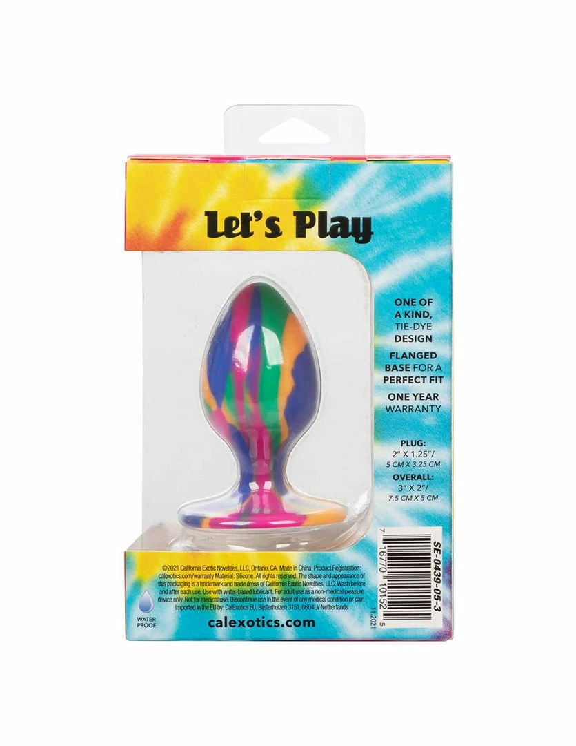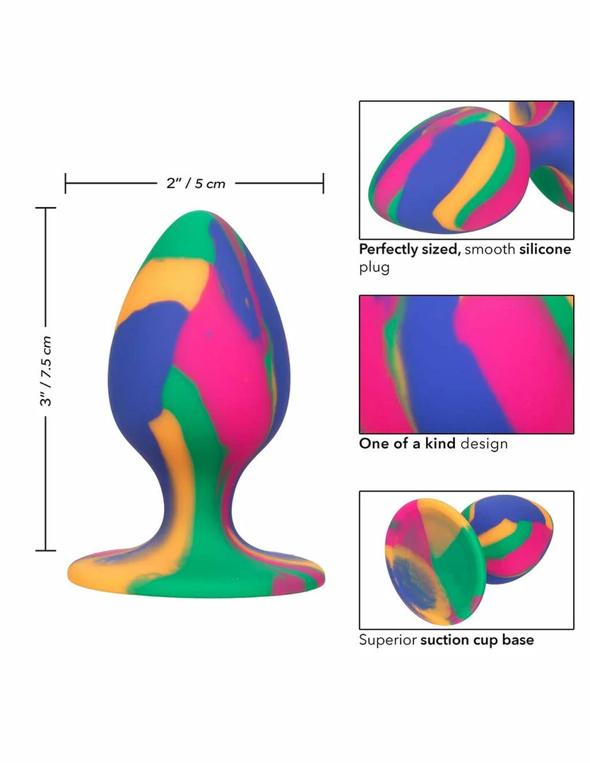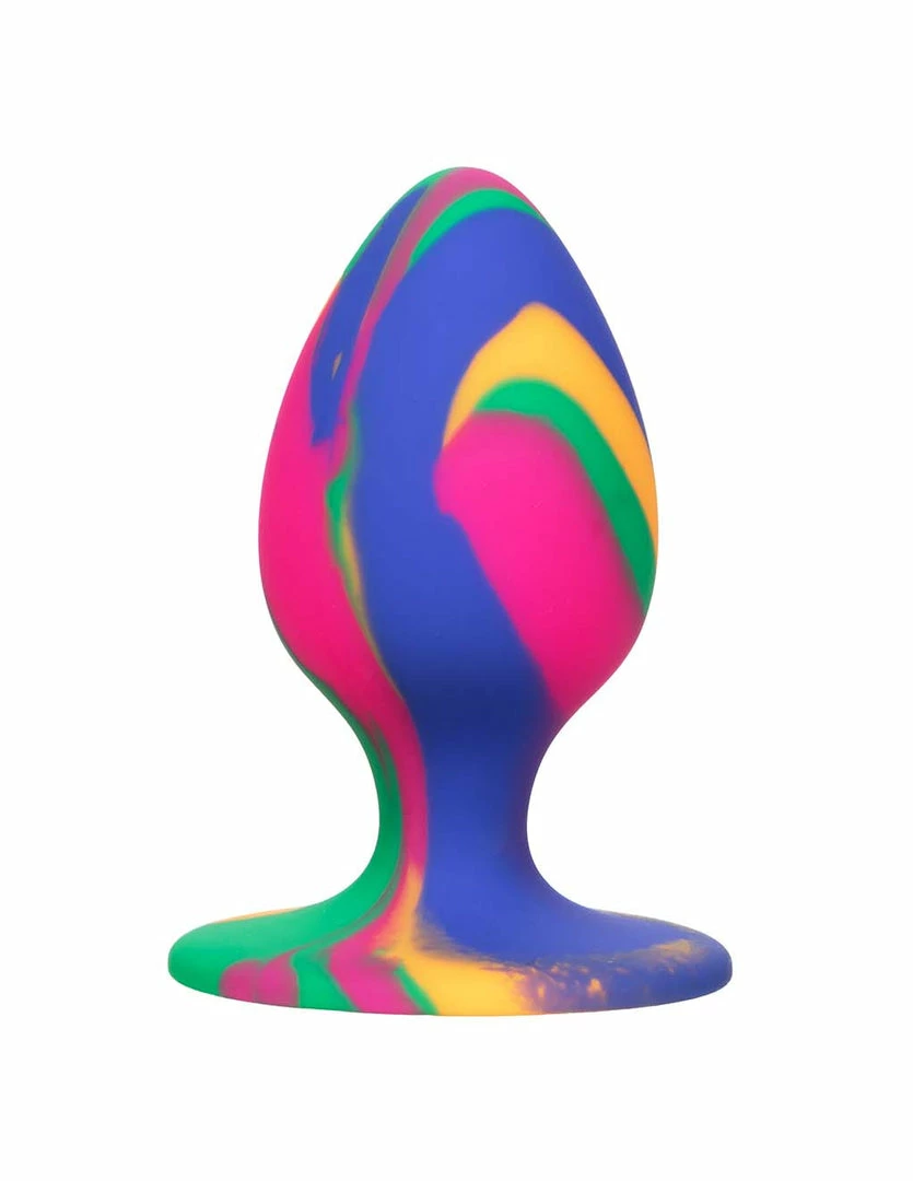 Dripped in color and ready for the summer is the Cheeky Tie-Dye Plug Medium. This nicely sized plug features a bright and colorful tie dye effect. The tapered shape of the plug will easily make it’s way into your booty. Feel the rivets and unique texture as it penetrates you. Beyond the flared base rests a suction cup perfect for mounting or pairing with your favorite compatible harness. It is made of a soft and smooth waterproof silicone. The overall length is 3 inches with a width of 2 inches. The insertable portion measures at 2 inches in length with a width of 1.25 inches. It is built for easy mounting in the shower or use with your favorite water based lubricant.