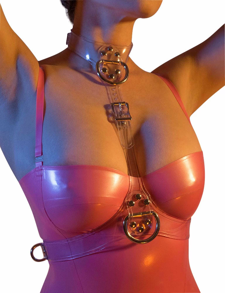 This sleek body harness from Clear CTRL is made to fit around the neck and under the breasts, highlight feminine curves, and adds extra points of attachment for your bondage play. The adjustable top piece fits around the neck like a collar and has a 1½ inch D-ring. A verticle adjustable center piece allows for comfortable wear, regardless of breast size. The bottom section of this harness also boasts a 1½ inch D-ring and fits under the breasts, buckling on the back.