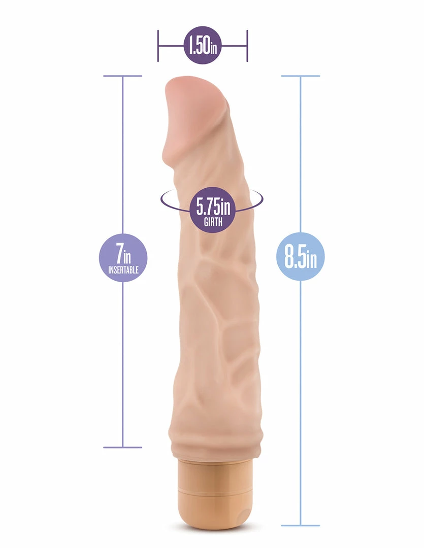 Dr. Skin Cock Vibe #6 is a 9 inch realistic vibrator with a prominent head. It is 9 inches long, 1.5 inches wide, and has 7.5 inches of insertable length. It is made of PVC material. This vibrator requires 2 AA batteries.