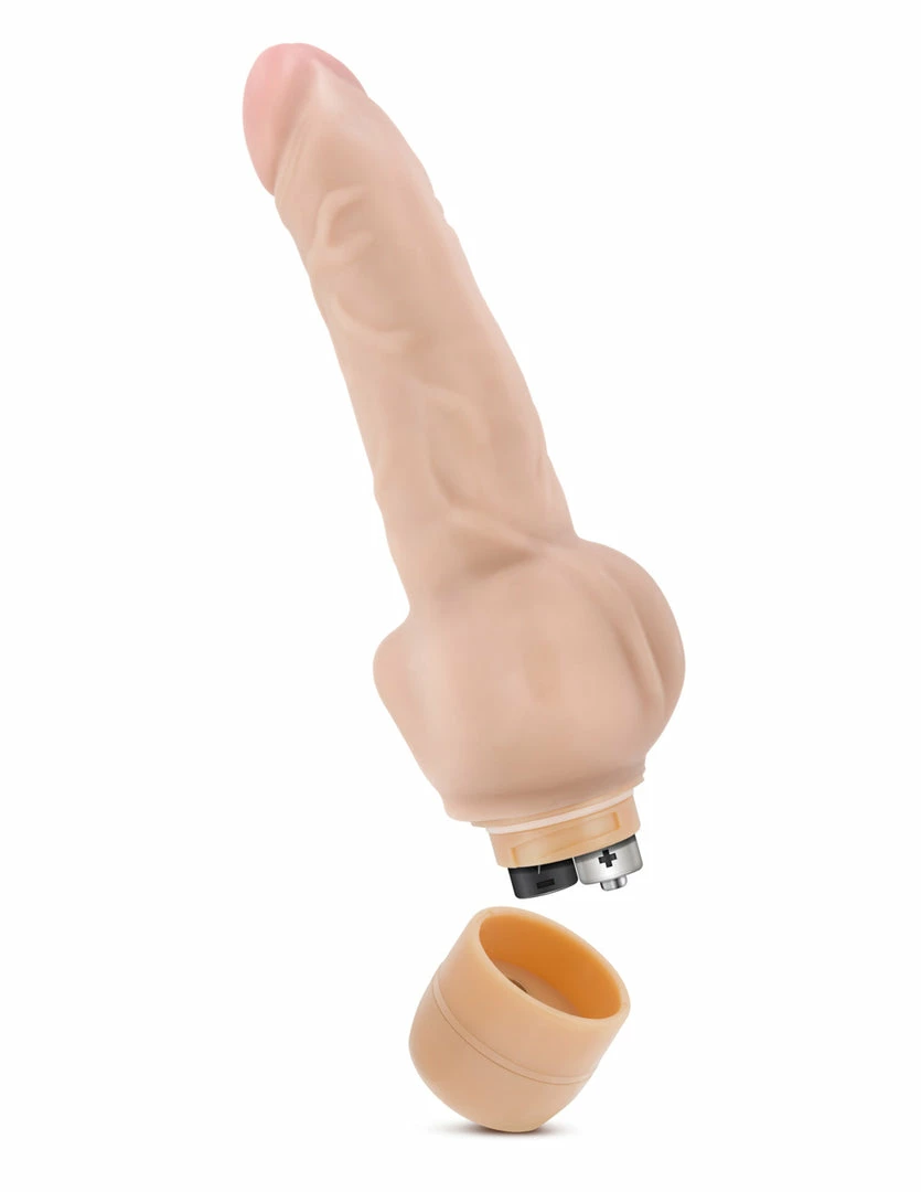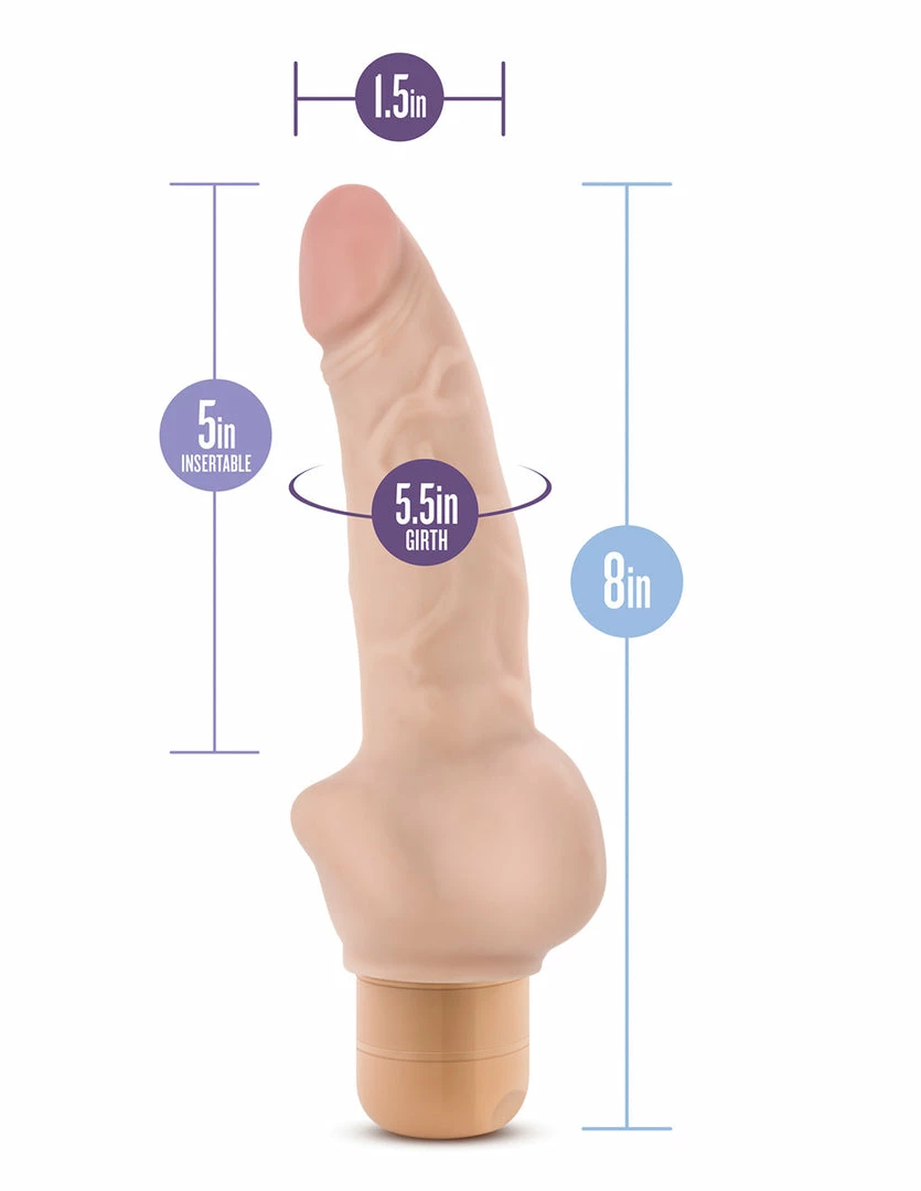 Vibe #12 by Dr. Skin is an 8 inch realistic vibrating dildo. This dildo is 8 inches long, 1.5 inch wide, and has 5 inches of insertable length. It is made of body safe PVC material. This realistic dildo has textured veins, a perfect head, and bulbous balls. It has multi-speed vibration. Turn the dial up and down to tease and please yourself. This vibrator requires 2 AA batteries. This vibrator is beginner friendly.