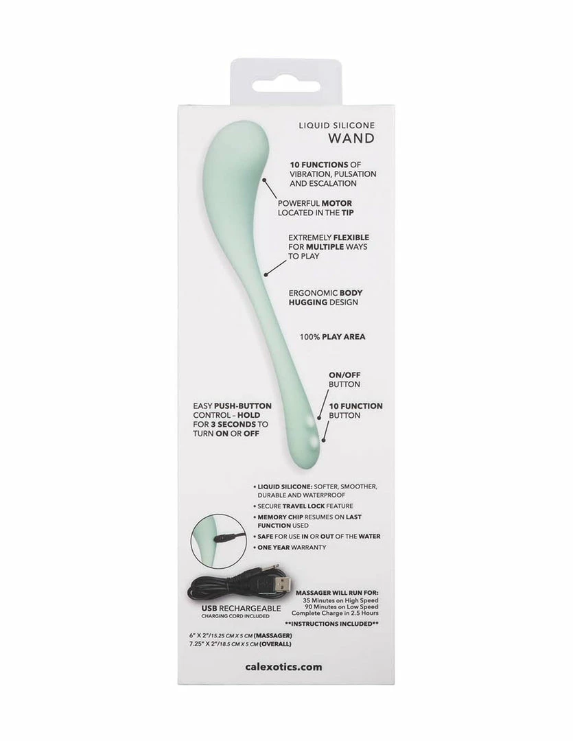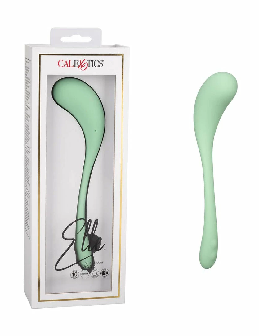 The Elle Liquid Silicone Wand is your new silky soft, flexible friend for your private playtime. This uniquely shaped vibrator has a bulb tapered head. It is contoured gracefully with the mid shaft having a very bendable and flexible body. The powerful built in motor operates with 10 different vibration functions. There is an easy 2 button control panel to immediately bring on the ultimate vibe giving you pleasure. The soft and smooth silicone is waterproof. It measures with 7.25 inches with a width of 2 inches, the massaging end measures with 6 inches of length. By using the provided USB charging cable for 2 hours you’ll be able to play and vibe for up to 90 minutes. With it’s vibrating functions, unique shape, and bendable properties, you’ll find how stimulatingly versatile the Elle Liquid Silicone Wand really is.