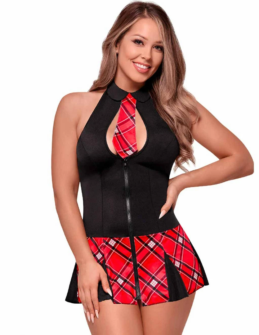 Ready for the after school special? Study up in the Exposed Dress Up Coed Cutie. This playtime dress gives the look of a schoolgirl uniform so you can be the teacher’s pet. The top portion is a sleeveless neckline with a collar. The chest has a keyhole to peep out your cleavage while it’s cleverly hidden by the plaid tie. The bodice of the shirt is tight hugging onto your torso, snatching in your waist, and supporting your chest. The bottom flairs out in a plaid schoolgirl skirt. The hemline is so short, your booty cheeks should playfully pop out so your teacher can see. Feel free to pair this look with stockings, a g-string, garter belts, or simply wear alone for a bare and sexy look. With the Exposed Dress Up Coed Cutie bedroom costume, you’ll be sure to ace that class and get that D.