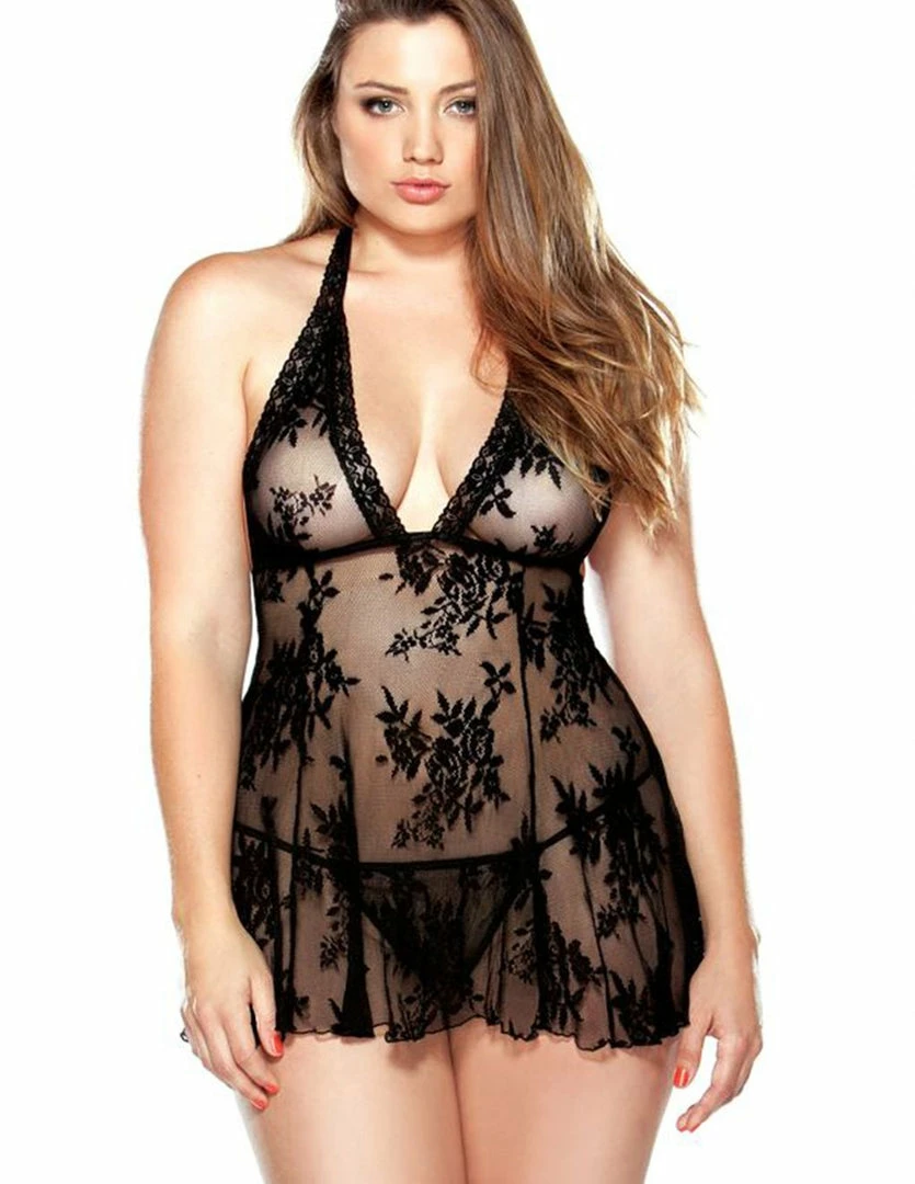 This seductive stretch lace babydoll is flattering for all figures and is offered in plus sizes. Soft, luxurious lace accentuates curves and ties delicately around the neck creating a deep V-neckline. This draping body falls subtly below hips and includes matching G-string.