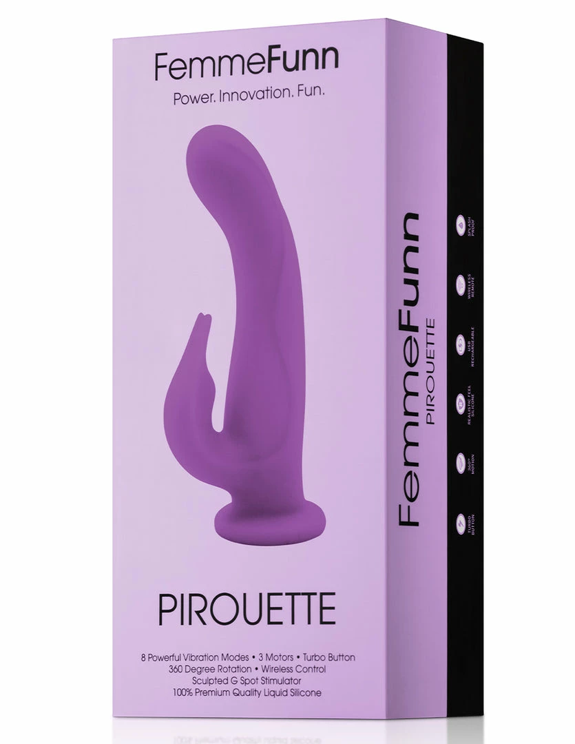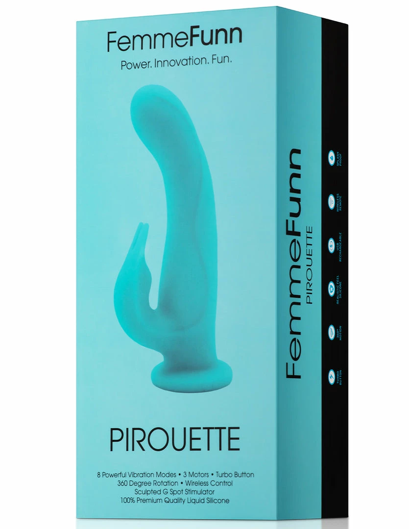 Pirouette by Femme Funn is a suction cup, dual stimulating vibrator. It is 8 inches long and 1.6 inches wide at its widest section. It has 6 inches of insertable length. Pirouette is made of Premium Liquid Silicone and ABS plastic. It feels smooth to touch. Pirouette is USB rechargeable and comes with a remote. It has 8 vibration modes with 360 degrees of rotating motion. The shorter piece stimulates the clitoris externally while the larger end rotates internally, stimulating the g-spot. A boost mode button can be found on the toy and on the remote. Boost is an increased vibration that lasts for 10 seconds of time. Modes can be played with using buttons on the vibrator itself or controlled with the remote.