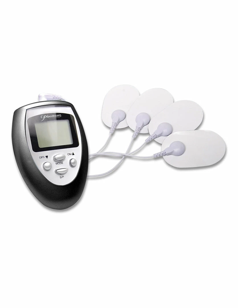 Shock Therapy Kits by Fetish Fantasy are easy to use and will massage your muscles. This kit comes with 1 digital power control unit, 4 electro-pads, and 4 leads. The digital power control unit requires 2 AAA batteries. We recommend pairing this kit with some thick water based lubricant or electrosex gel to increase conductivity. This kit delivers 3 pulsation patterns with gradual increasing levels. Change the tempo and patterns to create different combinations of electro-stimulation waves.