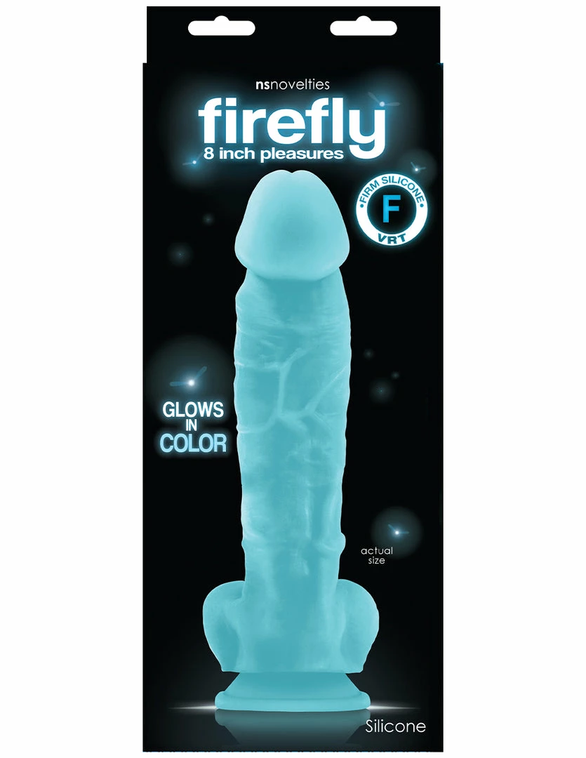 This Firefly 8 inch dildo by NS Novelties is whimsical and glows in the dark. It is made of silicone material, non-porous and very hygienic. The dildo is 9.3 inches total with 8 inches of insertable length. It is 3.2 inches wide. This dildo is girthy with veiny texture. It has a strong suction cup base. Stick it on to any non-porous surface for best suction results. This dildo is harness compatible. Playtime is more fun with a glow in the dark toy. This dildo has a 1 year manufacturer’s warranty through NS Novelties.
