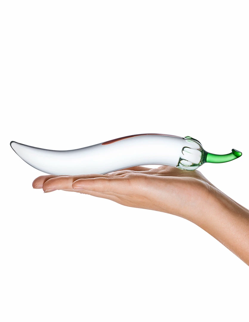 This Chili Pepper Dildo is made of borosilicate glass. It is 8.25 inches long, 1.15 inches wide, and has 7 inches of insertable length. Borosilicate glass is non-porous making it hygienic and hypoallergenic. Glass toys retain heat and cold temperatures well enough to explore temperature play. This chili pepper has a vibrant green stem, narrow curved shaft, and pointed tip. Tease yourself or your lover with its pointed tip. When inserted, this dildo massages your entryway, the G-spot, or P-spot with its curved shaft. This Chili Pepper Dildo is discreet. It can be stored out in the open to look like a piece of art.