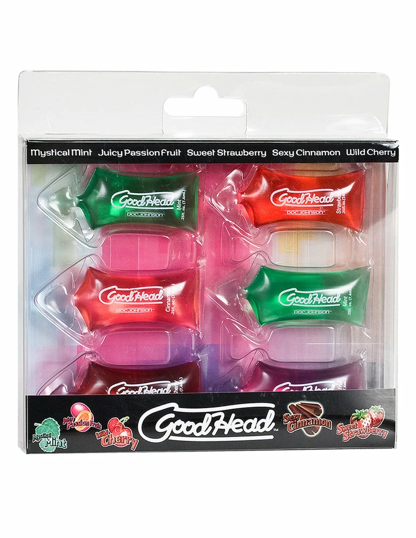 GoodHead Pillow Packs by Doc Johnson are great blowjob tricks and treats. This pack comes with 6 mouth watering flavors. They are sugar-free, non-sticky, and water based. Pillow packs are individually packed, making them easy to use and easy to dispose. Squeezing a pillow pack directly into your mouth will keep your hands clean. These gel lubes are edible and safe to swallow.