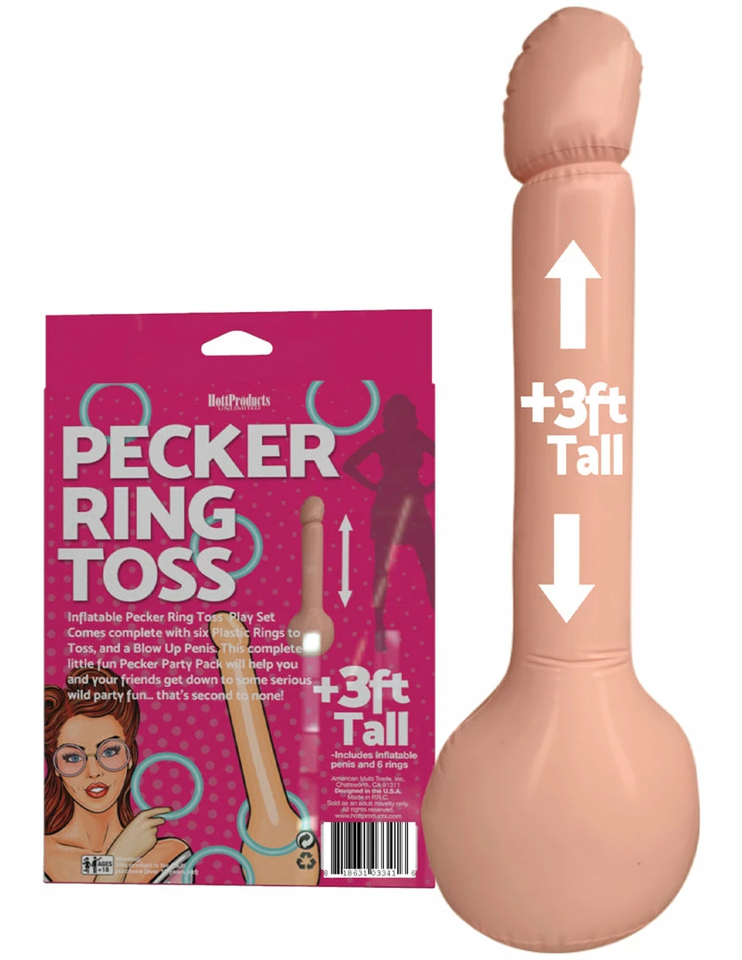 Play the Inflatable Pecker Ring Toss Game by Hott Products. This 3 foot tall blow up pecker will have your friends screaming in excitement. Take turns tossing rings around it. This inflatable pecker is made of PVC. It comes with 6 colorful rings. It could be turned into a drinking game where a missed toss makes the player take a shot. It’s a great party motivator to keep the party going.