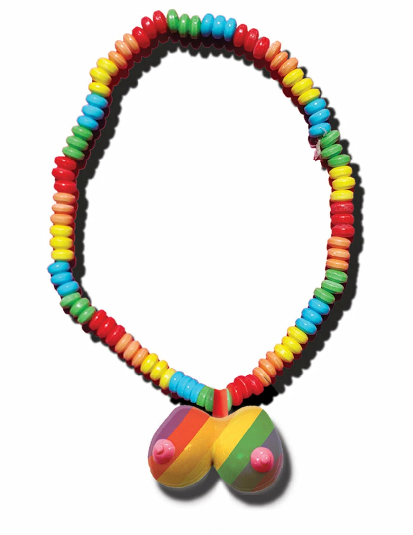 The Rainbow Boobie Candy Necklace is sweet and fun to wear. You can such on these boobies anytime the craving for something sweet hits. The colors are loud and festive. This necklace is a great statement piece. It tastes great with a burst of fruity flavors.
