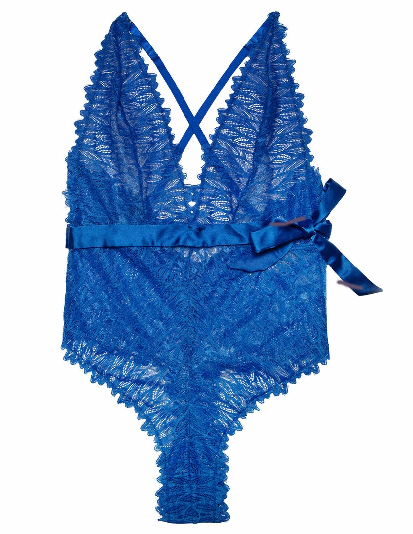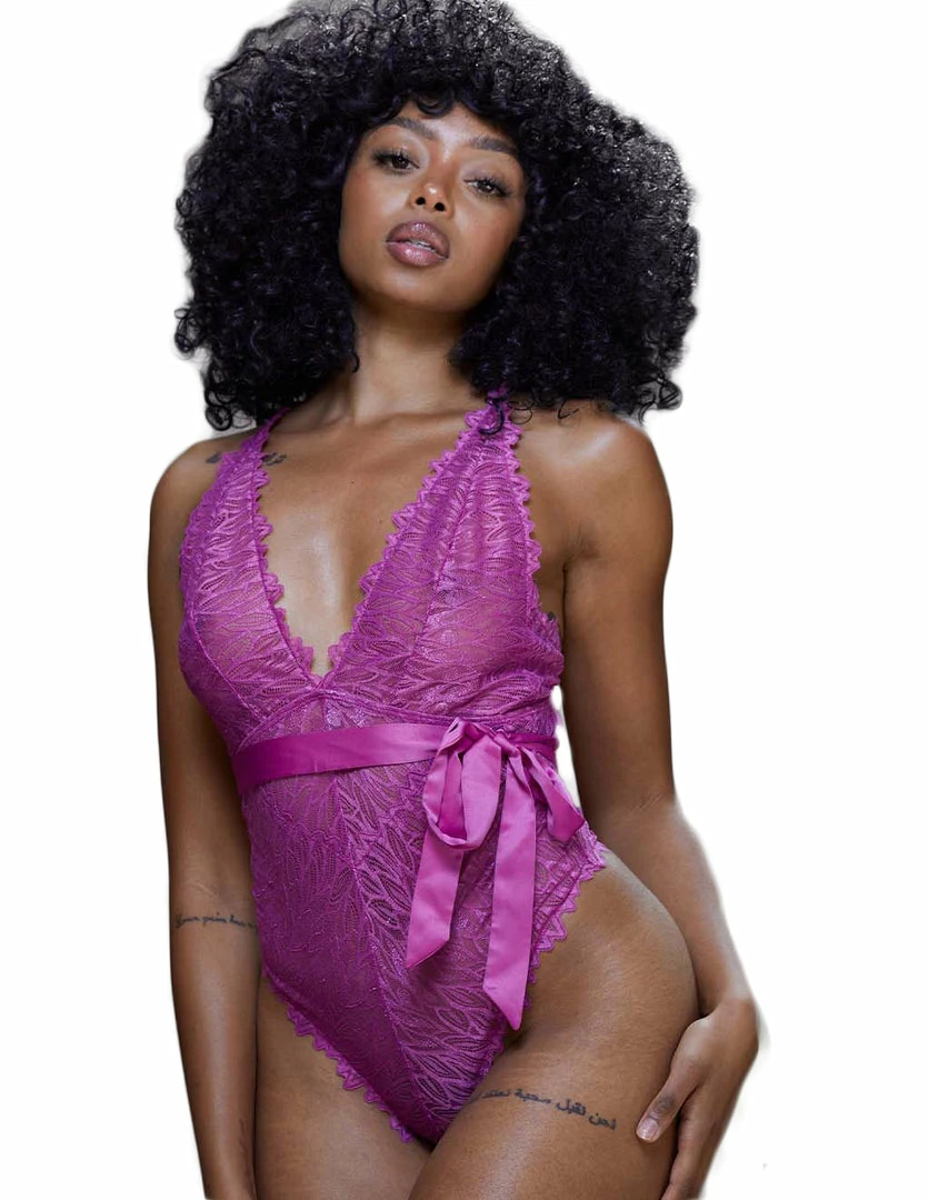 Our HUSTLER Apex Plunge Teddy is soft and clings to all your sexy curves. It has a satin bow around the waistline. The soft teddy cups are triangular shaped with feather lace lining. It has a deep plunging neckline. The straps are adjustable and cross at the back. The sides have a high cut waistline. The back has a thong back cut. Flaunt your curves as you model this piece for your lover.