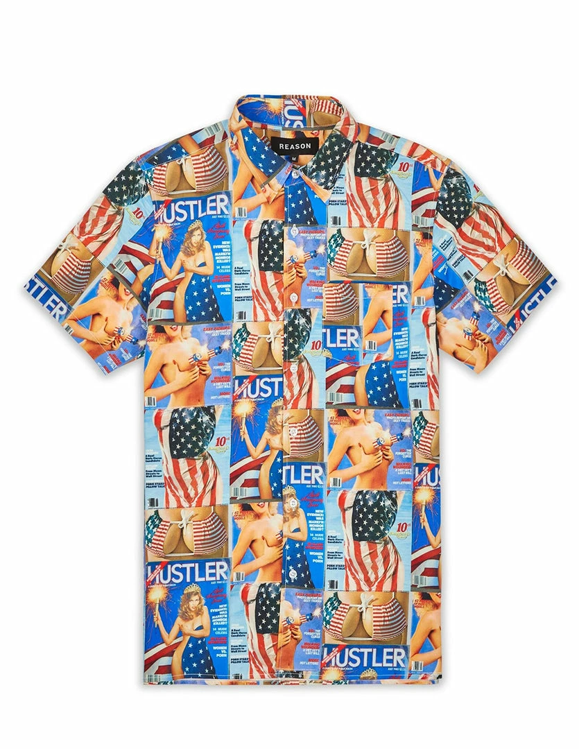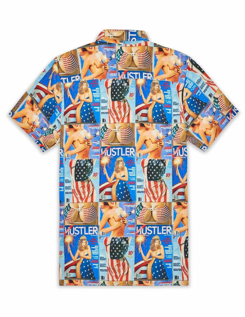 Our HUSTLER® Cover Shirt has a clean look with edgy style. This short sleeved button up shirt is bright and show stopping. It features our HUSTLER® red, white, and blue patriotic covers featuring our HUSTLER® Girls in American flag bikini tops, American flag covering, and American flag dresses. It is made with quality material and comfortable to wear. Celebrate freedom by expressing yourself freely with this shirt. Wear it to your next barbeque, party, or any event.