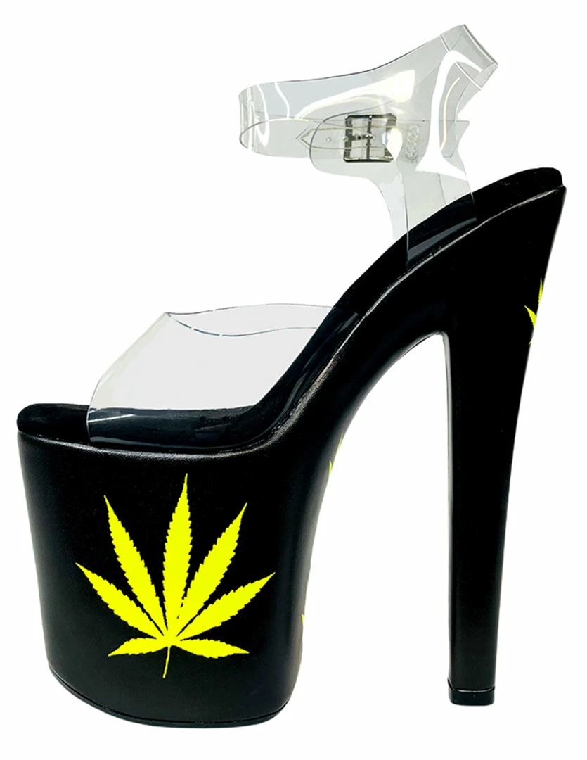 Weed love for you to catch the smoke that is the HUSTLER® Demi Weed Platform heels. These sandal heeled platform shoes will keep you up high with the 7.5 inch heel. The 3.5 inch platform keeps you stable, balanced, and more relaxed as you walk. The clear ankle straps keep you planted into the shoe and locked in for a night full of high energy all while the peep toe lets your feet breath. The eye catching detail of these platform heels are the weed leaf print in a neon yellow scattered throughout the heel. You’ll never want to leaf the beauty of these HUSTLER® Demi Weed Platform heels.