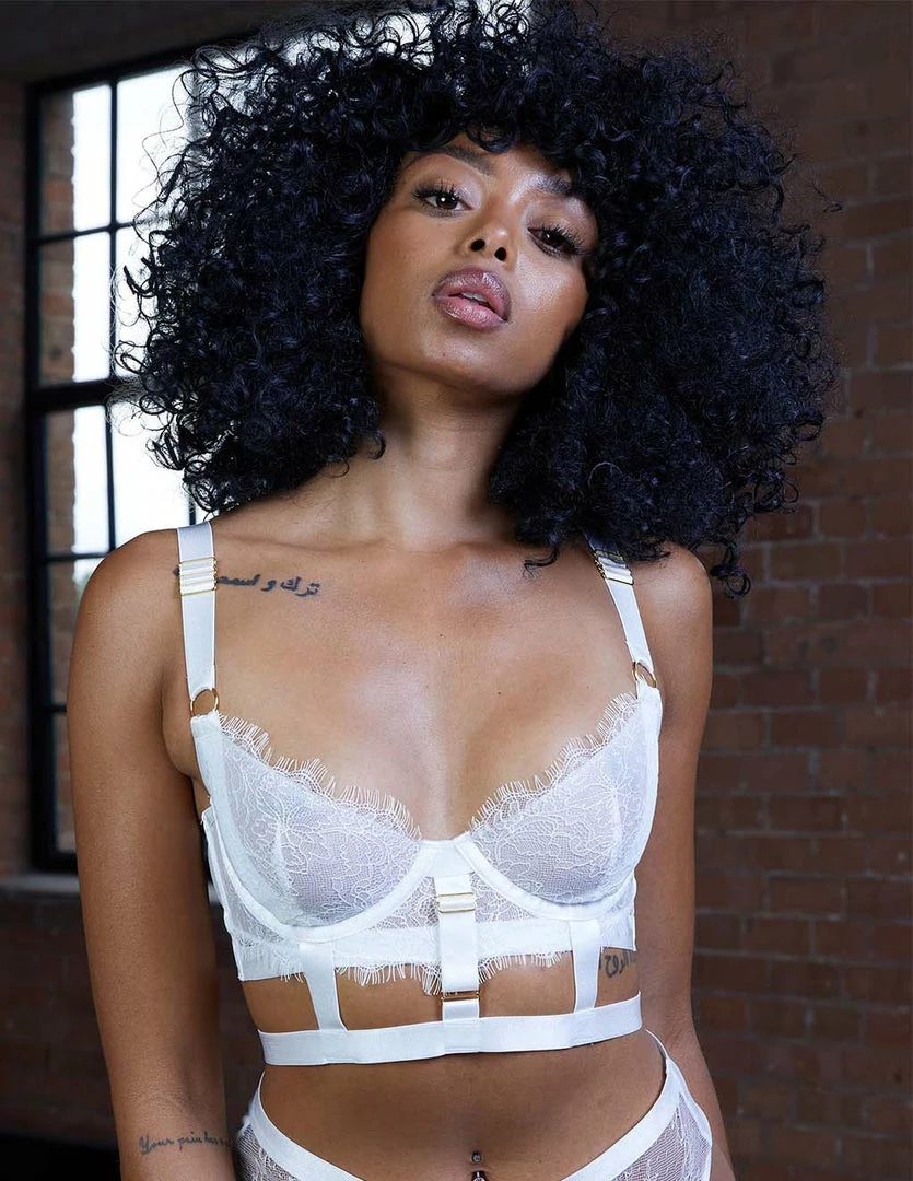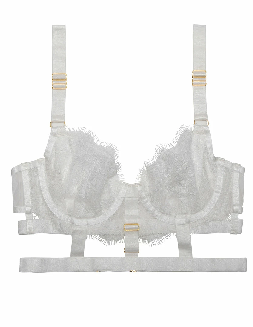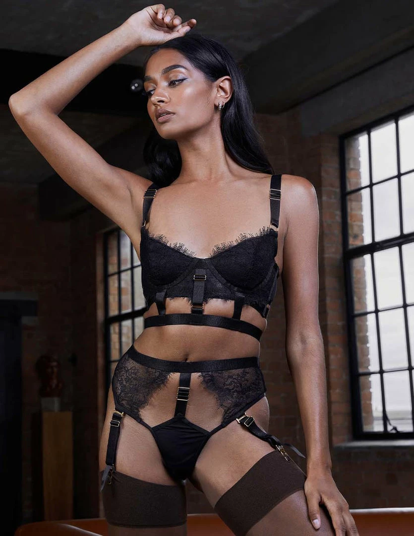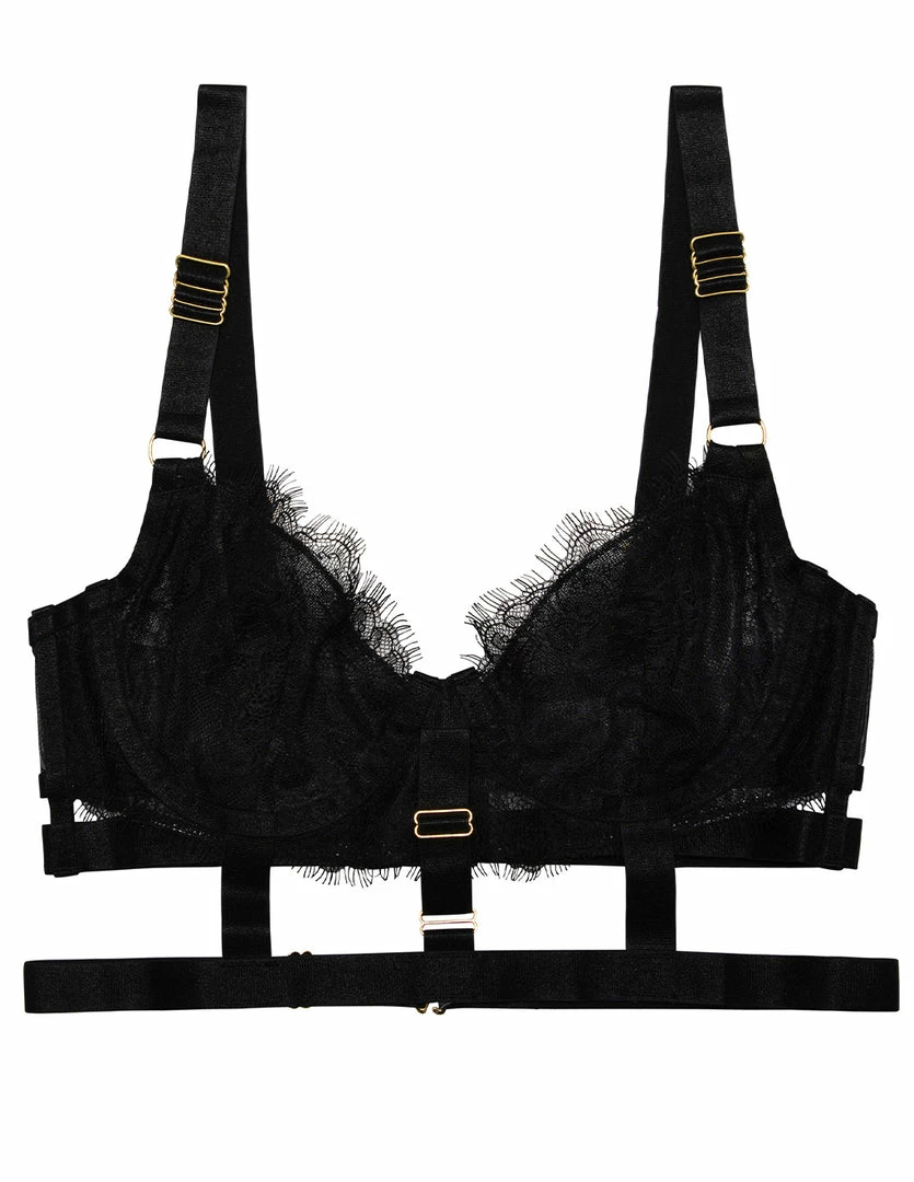 Our HUSTLER Lace Cage Bra is provocative. It features lace details and gold accents. It has adjustable shoulder straps and an adjustable cage strap. The cups are soft with an underwire. Scalloped lace softly lines the cups against the cleavage. The back has mesh paneling with a hook and eye closure. Pair this bra with our HUSTLER Lace Cage Thong (sold separately).