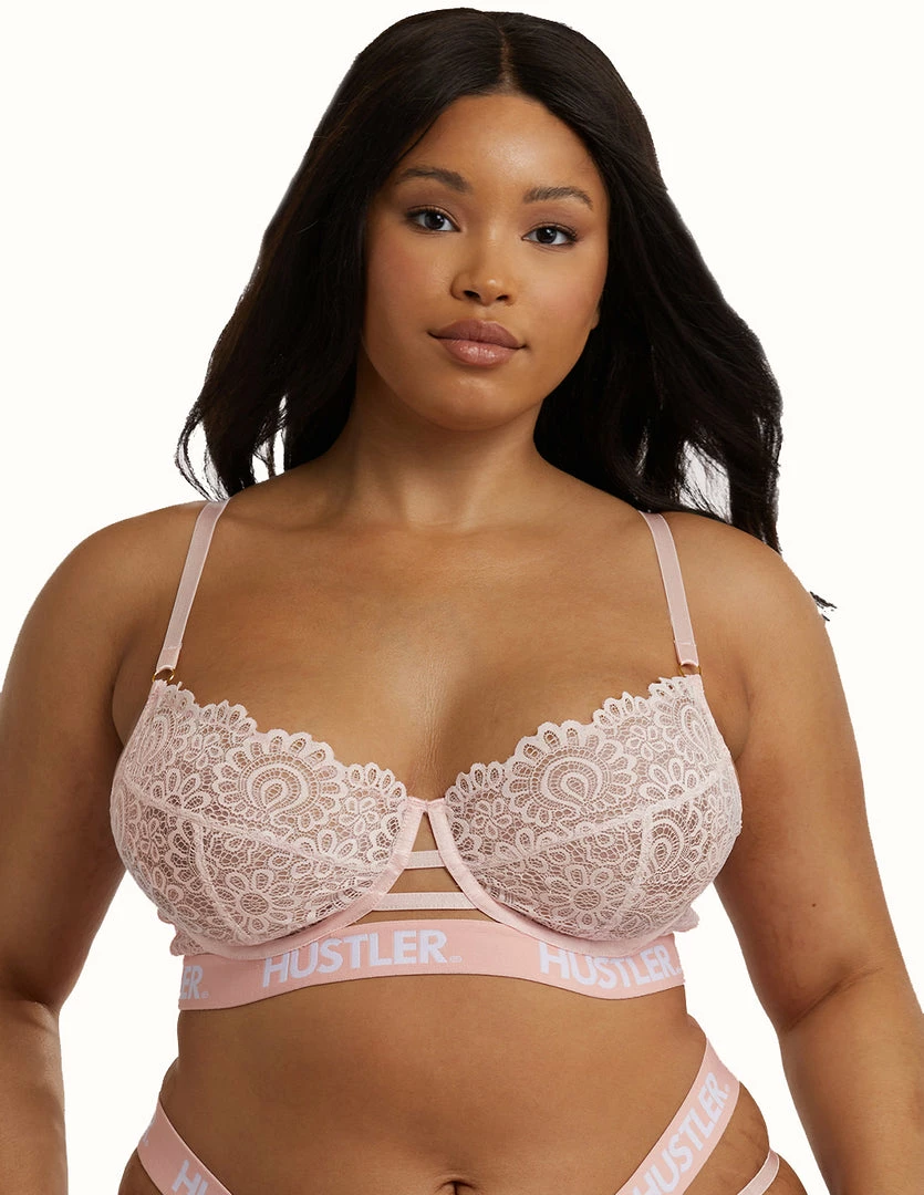 Our Baby Pink HUSTLER® Logo Lace Bra* will make your cleavage look nice and sweet. Our lace bras are made from quality material. The lace stretches and forms your breasts in the most enticing fashion. Its elastic band is thick and stretchy, featuring our logo. It has adjustable straps with a hook and eye closure. Pair this cute bra with our HUSTLER® Logo Lace Thong or Brief to complete the set.