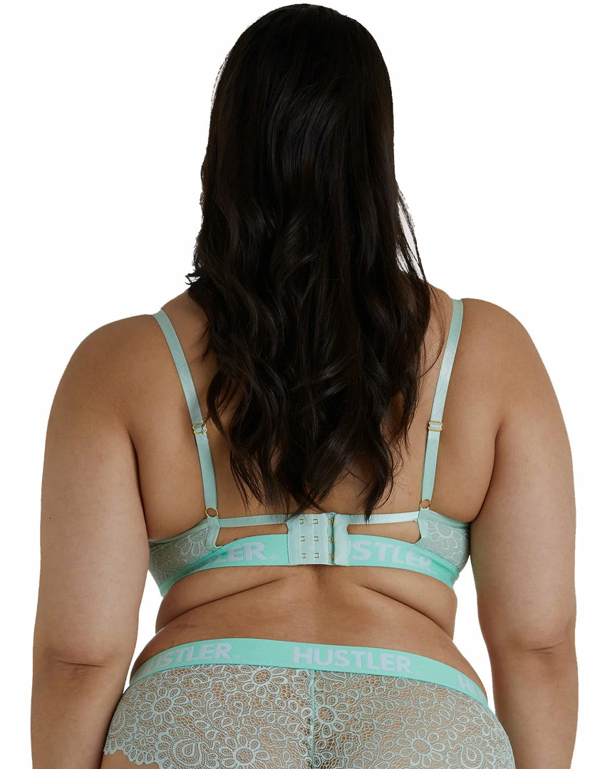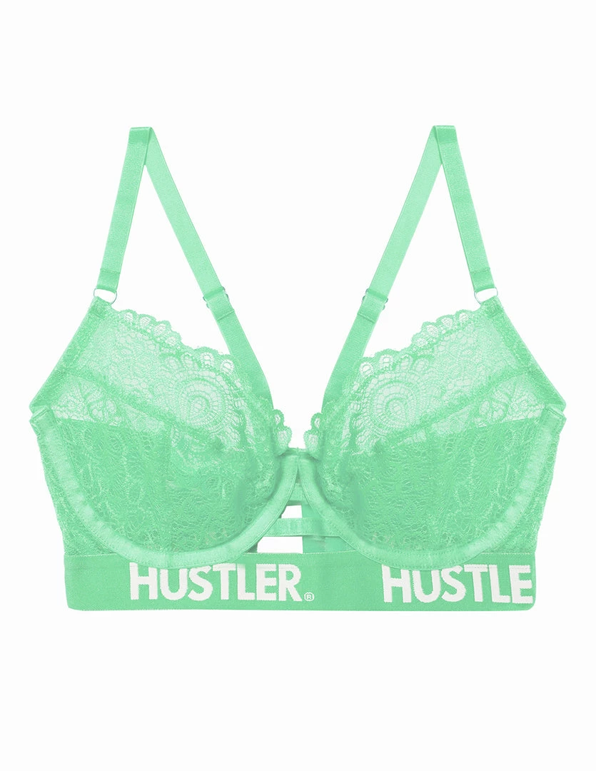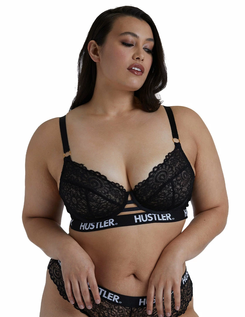 Feel sexy in our HUSTLER® Logo Lace Bra. This style was made for Curves of all sizes. These Curve sized bras come in size 38B to 42G. The soft lace, underwire lined cups shape and enhance the look of your breasts. Triangle cutouts pull attention towards the midline. Thick adjustable straps support your breasts and don’t dig into your skin. Our HUSTLER® logo is displayed around the thick elastic underbust. It is stretchy for your comfort. The back is designed with keyhole openings to give it a strappy design. Gold colored hardware beautifully contrasts against the bold color lace of the bra. You will love the fit and look of this bra. Pair it with our HUSTLER® Logo Lace Thong Curve.