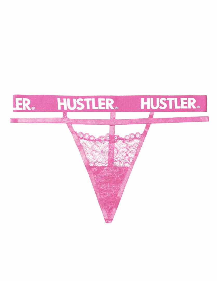 Our HUSTLER® Logo Lace Thongs hug your hips and will make you feel sexy. It has a cage style elastic band, lace panel, and thong back cut. The open keyholes in this cage style allows more skin to be seen with the comfortable security of the elastic band. The strappy cage style enhances your hips and waist by outlining your sexy curves. Pair this thong with our HUSTLER® Logo Lace Bra 32-36.