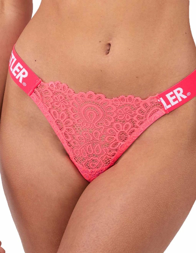 HUSTLER® Logo Lace Thong Neon Pink will add a pop of color to any outfit. It has thick elastic straps with our embroidered logo. The straps sit on top of the hips. It is made of stretch mesh material. Pair it with our HUSTLER® Logo Lace Bra Neon Pink to complete the set.