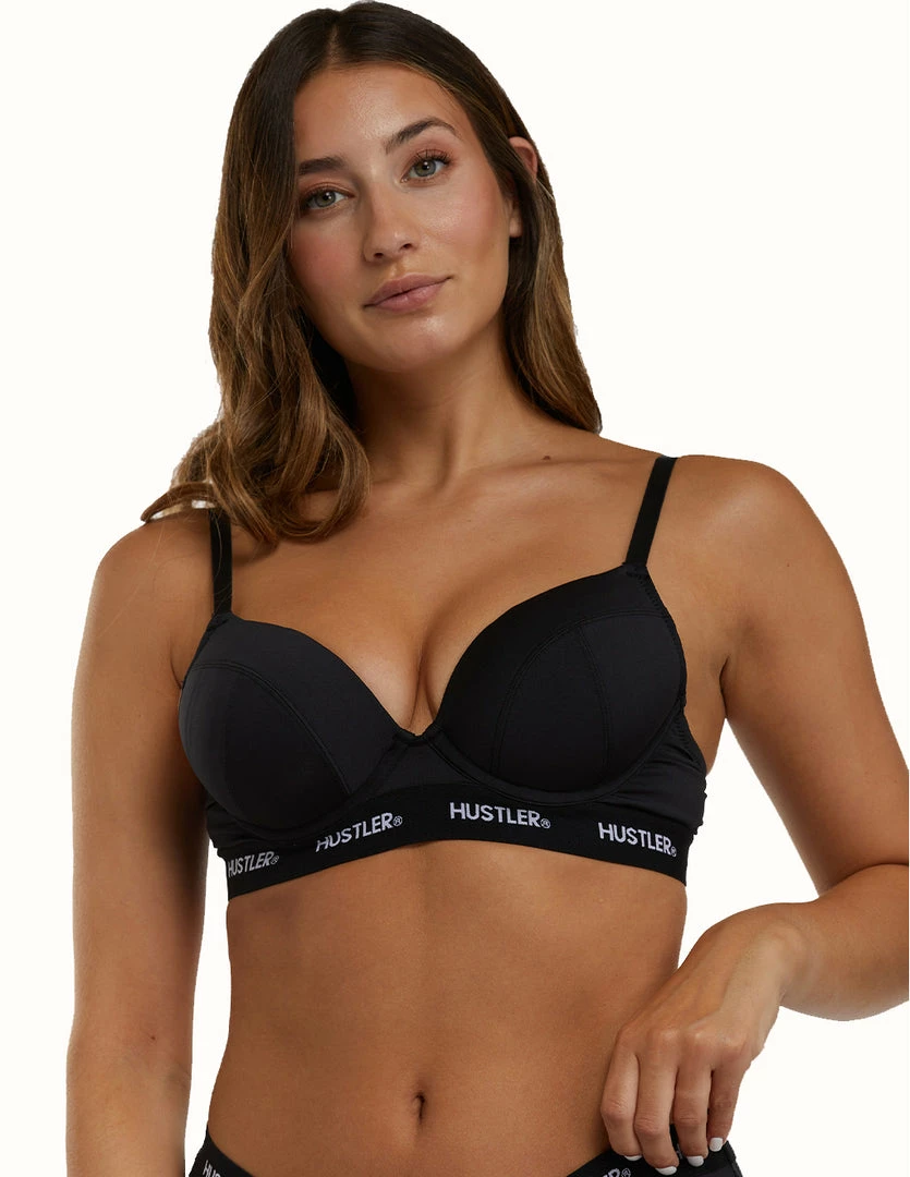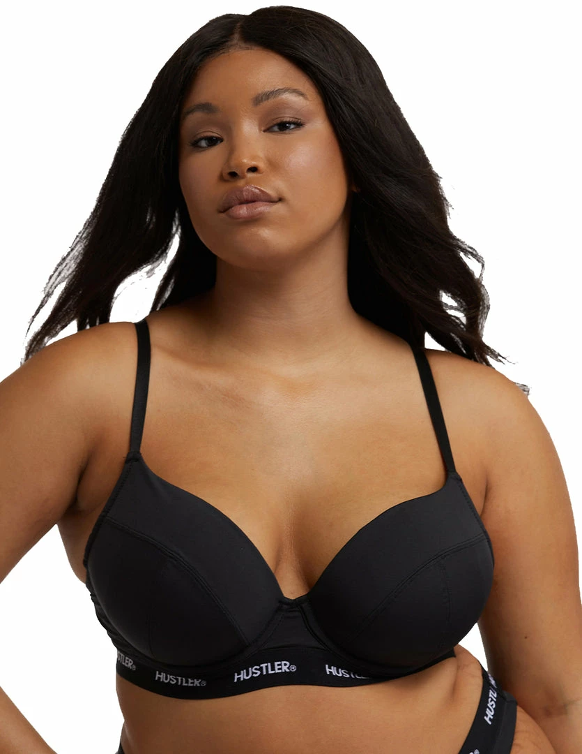 Our HUSTLER® Logo Plunge Push Up Bra* will give you the boost you need. It has a deep plunging neckline. This bra pushes up the breasts and will make your cleavage stand out. Its elastic band is thick and comfortable. The fabric is made from quality materials. This bra has adjustable straps with a hook and eye closure. Pair it with our HUSTLER® Logo Brief or Thong to complete the set.
