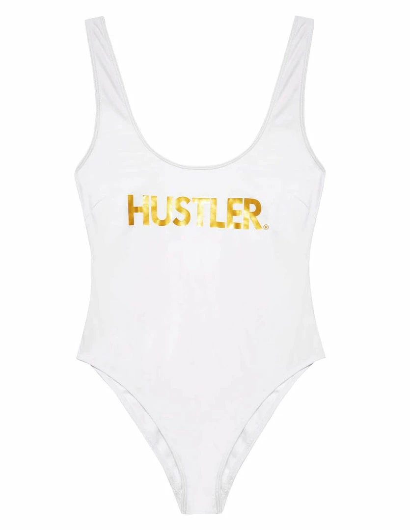 Get ready to send hot girl vibes with our HUSTLER® Logo Swimsuit. It accentuates the hips and thighs with its high leg cut sides. This one piece features our HUSTLER® logo in gold foil print. It captures the light and contrasts well with the swimsuit. The back is low cut and accentuates sexy shoulders. This swimsuit looks flattering on all body types. Our swimsuit is made with quality blend materials. This swimsuit also looks cute as a top. Wear them with jean-shorts as a quick hot outfit.