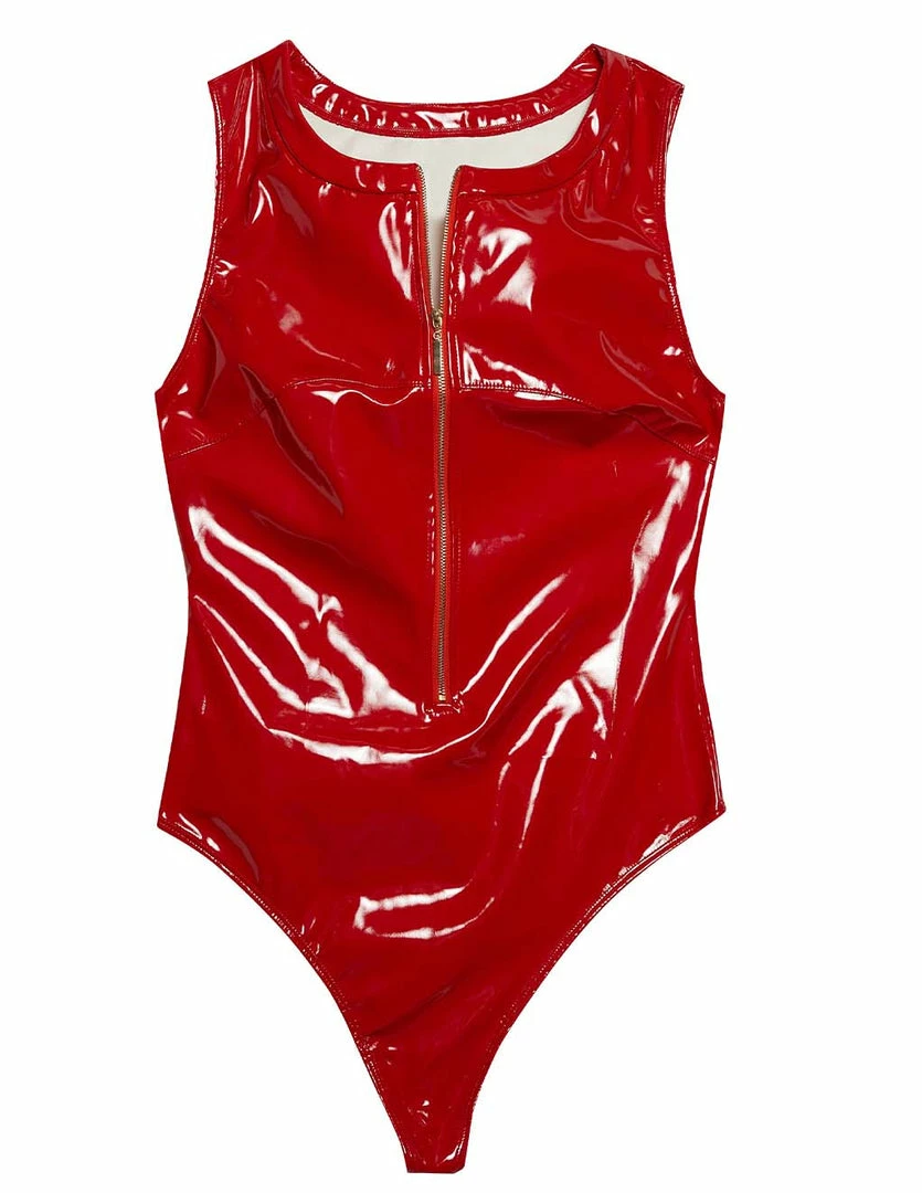 HUSTLER® Maxine PVC Bodysuit is a great item to have when you’re feeling frisky. This wet look bodysuit is easy to put on and on with a front zipper. The PVC repels moisture and also adds to your BDSM look. Style this up with pasties underneath or nothing at all. For more cleavage and chest room, simply use the zipper down to your liking and comfort. This is the perfect bodysuit to have for your Valentine’s day kinky affairs.