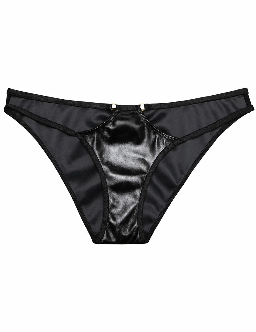 Our HUSTLER PVC Ruched Back Bikini feels cool to wear and warms to your body. It has open cut outs on the front sides of the bikini. Gold ring embellishments hold the top two straps to the bikini. The back is ruched with a cheeky back cut. Complete this look with our HUSTLER PVC Sweetheart Cup Bra and our HUSTLER PVC Strappy Suspenders.